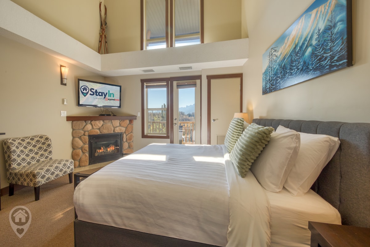 Deze rustige suite op de bovenste verdieping, omgeven door uitzicht op de bergen, beschikt over een gezellige woonkamer, open haard en slaapbank met multimediacentrum om je verblijf aangenaam te maken. De grote slaapkamer heeft een comfortabel kingsize bed. We hebben een volledig uitgeruste keuken en wasserette voor je eigen gemak. Geniet van toegang tot alle voorzieningen, waaronder een ondergrondse verwarmde parkeerplaats, een fitnessruimte, een zwembad, een bubbelbad en een stoombad. Slechts 5 minuten van de heuvel en een korte wandeling naar restaurants en bars.