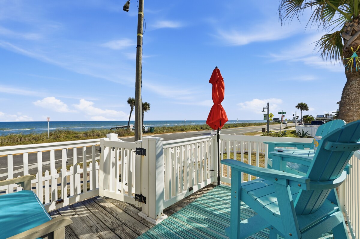 Verwarmd zwembad. Direct uitzicht op het strand/de oceaan, toegang tot het strand Gerenoveerd december 2024! Neem geen genoegen met minder! super schoon, 2 Bd, 2 volledige badkamers 3 privédekken , Lrg privégarage voor fiets/auto. Stappen naar het strand. Je zult geen andere volledig gerenoveerde plek zoals deze vinden met zwembad en garage voor deze prijs! Wifi (snelste aangeboden) volledige kabel. In het historische Flagler Beach. Nieuw - high-end elektrische open haard toegevoegd aan hoofdslaapkamer, restaurants en pubs, koffiehuizen op loopafstand - 25 minuten. N van Daytona & 25 min. S of St. Aug