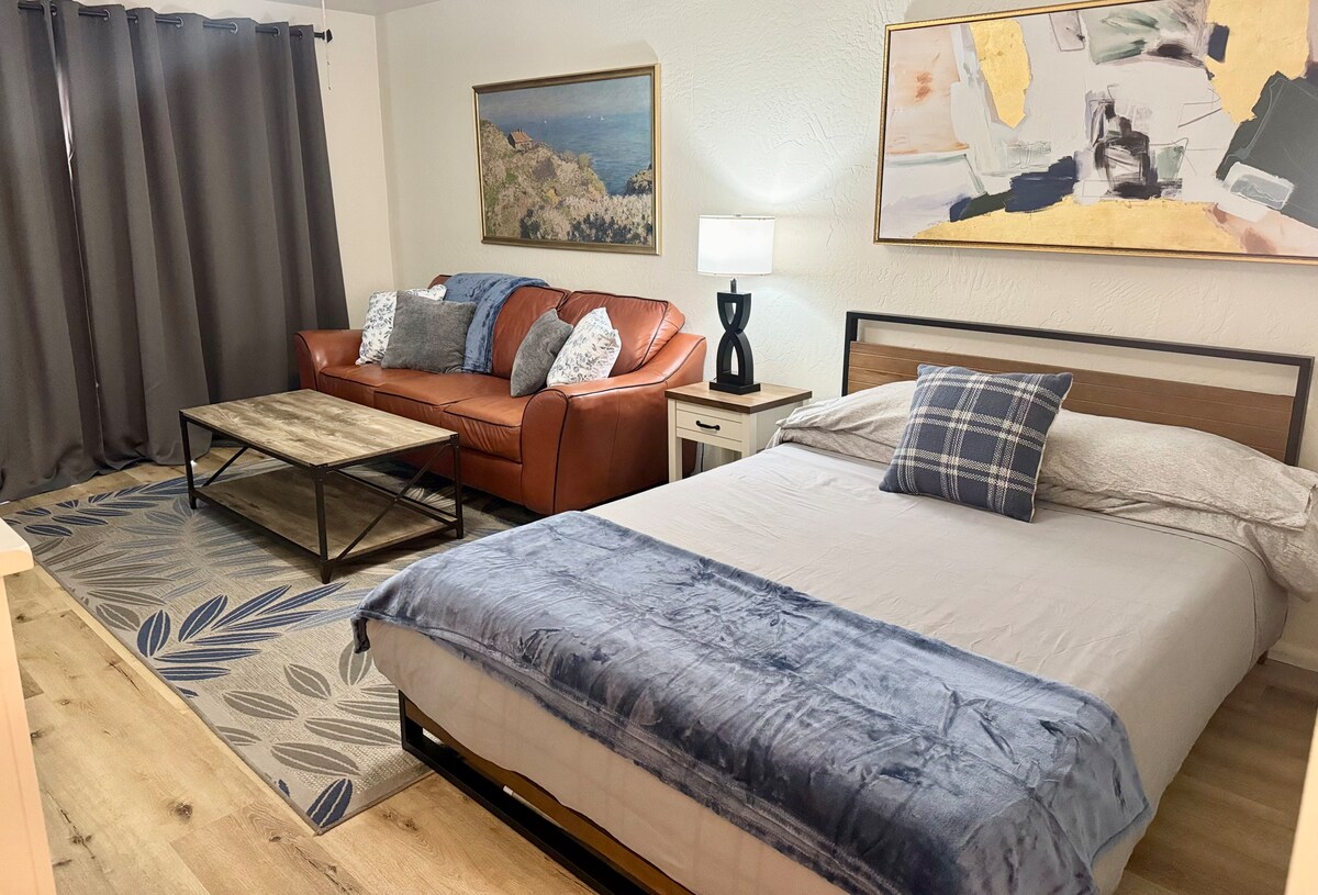 1e verdieping Casita met eigen ingang en eigen oprit parkeren. Afgelegen, gedeeltelijk overdekte, ommuurde, geplaveide patio met George Foreman-grill voor majestueuze zonsopgangen om te ontspannen en tot rust te komen. Oversized Bdrm w/Queen Bed, Great Rm w/ Daybed & Loveseat slaapbank plus kitchenette met koelkast, broodrooster, magnetron, broodrooster -ven en binnengrill. Weelderig uitzicht op de landschapsarchitectuur vanuit het raam van de baai voor 4. 3/4 badkamer met grote douche en wastafel met spiegel van muur tot muur. Antiek bureau, streaming-tv met Roku-stick en gratis wifi.