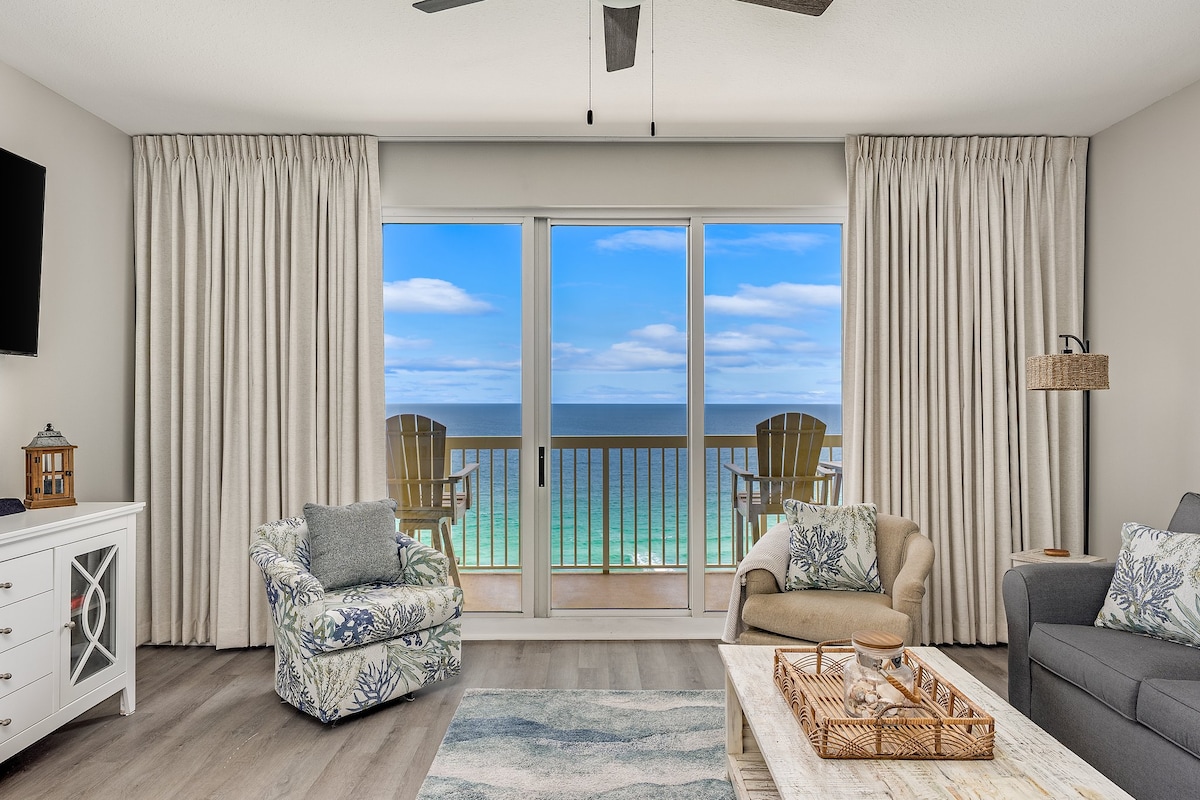 My Happy Place | 2BR+bunkroom/2BA 15e verdieping condo met episch uitzicht op de Golf! GRATIS strandopstelling (2 stoelen + 1 parasol, mrt–okt 2025) plus toegang tot 8+ extra stoelen, 3+ parasols, speelgoed, boeken en spellen. Stel je voor dat je op het balkon loungt, in het zwembad spettert of na zonsondergang het diner grilt! Supersnelle wifi, 4 tv's, wasmachine/droger, goed uitgeruste keuken en balkongrill. Resort hot tub, vuurplaats en goede vibes inbegrepen. $ 50 Resortpas (0–1 auto/verblijf), $ 100 voor 2. Weekends zijn snel volgeboekt, weekdagen zijn een aanrader!