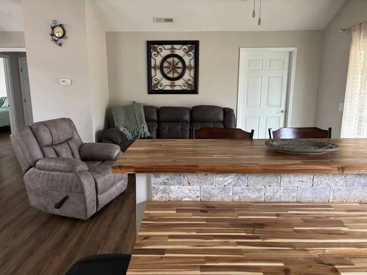 Wonnie's huis heeft voldoende ruimte voor familie. Bestaat uit twee kingsize bedden en een queensize luchtbed. Twee volledige baden met inloopdouches. Dubbele oven in keuken, vaatwasser, magnetron, bank en loveseat beide met fauteuils, snel glasvezelinternet, smart-tv's in alle kamers. Centrale airconditioning/verwarming. Ruime veranda voor loungen, koffiepot en K-cups, broodrooster en wasmachine/droger met wasbladen inbegrepen, strijkijzer en strijkplank, zeer schoon.