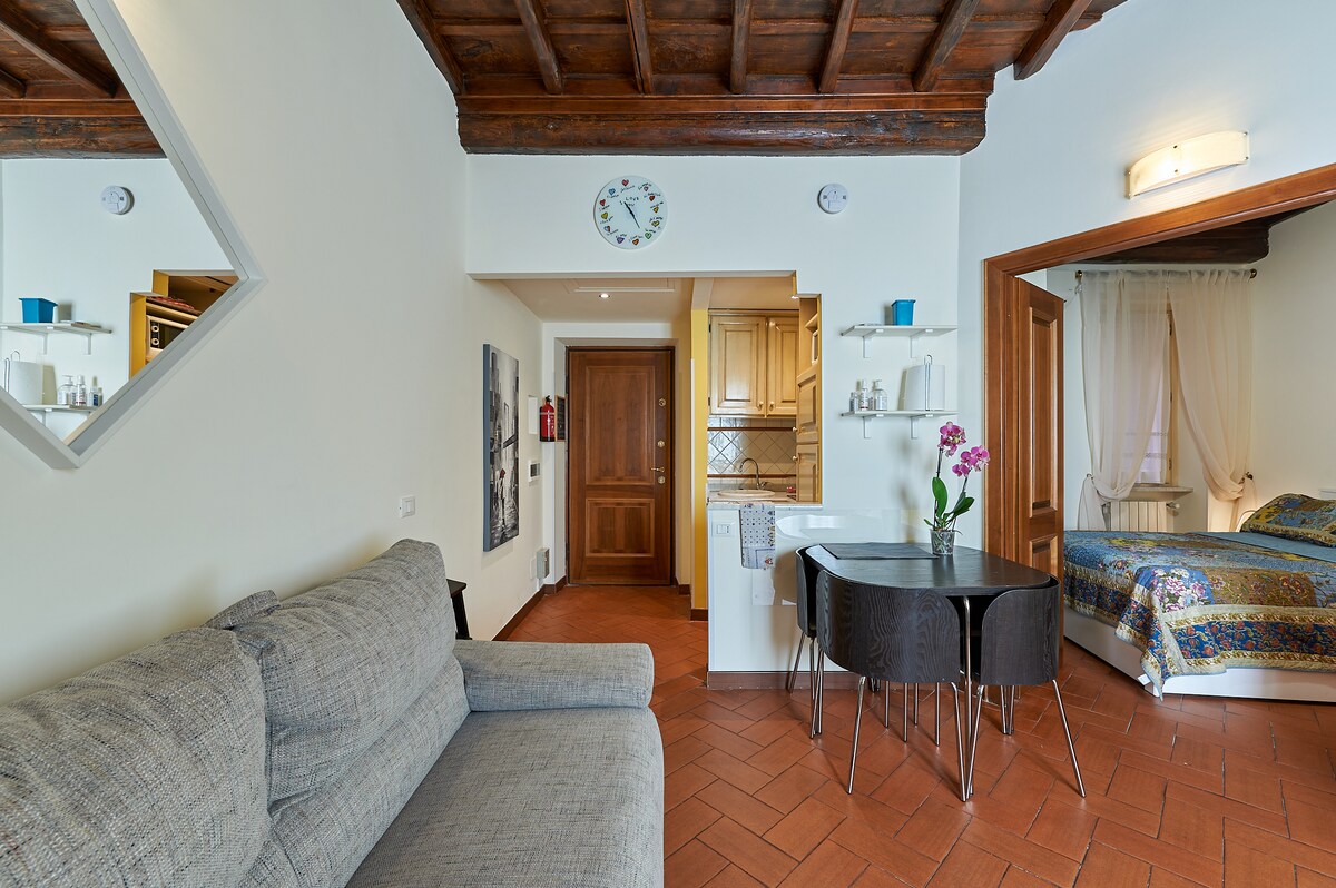 Located on the top floor of a historical building (with elevator) in the heart of Trevi, this apartment just renovated allows you to enjoy Rome up to 4 people It is situated literally two steps from the most famous sites: Trevi fountain, Spanish Steps, Trinità dei Monti and Villa Borghese are within walking distance (less than 10 minutes). The style is charming and refined in old wood and bricks; It warmly welcomes those who are looking to experience the Eternal City starting at the heart