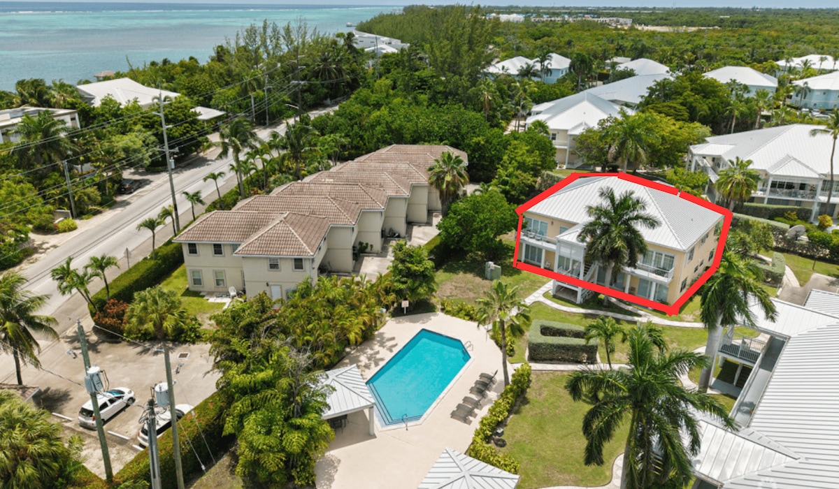 Cool schoon eigentijds heiligdom met uitzicht op het water; een appartement met twee slaapkamers/twee badkamers met een volledige keuken en woonkamer vol met alle populaire voorzieningen (wifi, kabeltelevisie, Apple TV, Netflix, Playstation-spelcomputer, centrale airconditioning, strijkijzer en strijkplank, wasmachine en droger, buitenterras, zwembad en gratis parkeergelegenheid) - gunstig gelegen in Grand Harbour. The Shoppes at Grand Harbour, & Harbour Walk liggen naast de deur. Perfect om te verkennen en te genieten van alles wat de Kaaimaneilanden te bieden hebben.