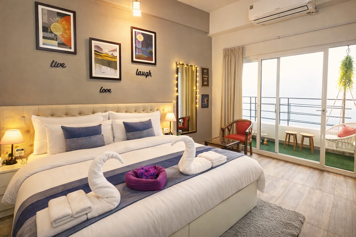 A modern luxury 2BHK with 1 Luxurious bathroom with premium fittings—curated for refined comfort and seamless living.Calm tones,layered lighting, and thoughtful detailing shape an inviting atmosphere throughout.The layout flows naturally between living,dining, and resting areas,supported by a well-equipped kitchen,premium linens, and reliable connectivity.Clean lines, subtle finishes, and attentive upkeep reflect quiet sophistication,offering a polished stay defined by comfort,clarity, and ease.