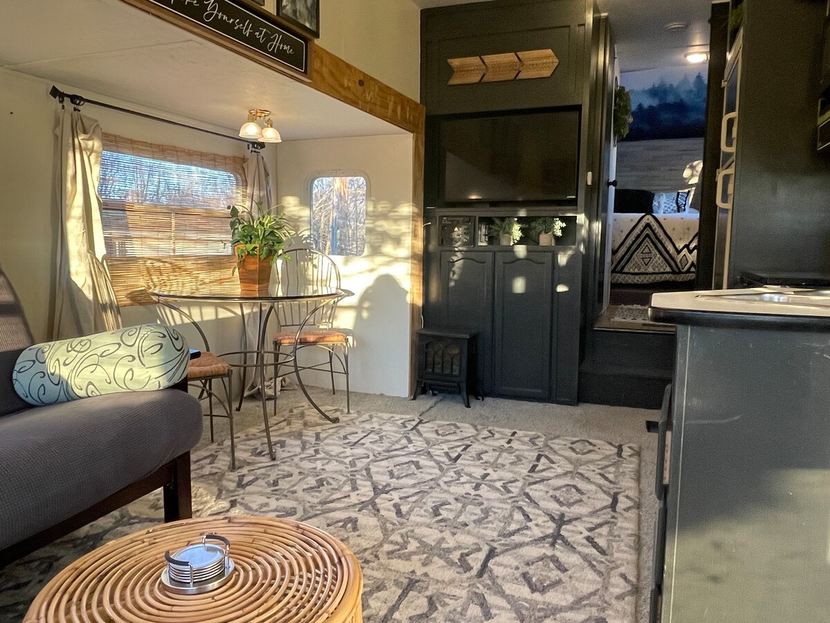 Doe rustig aan in deze unieke en rustige blokhut met centrale lucht/warmte en sleutelloze ingang. De woonkamer heeft een 55 in smart-tv met Roku, kleine koelkast, magnetron en keurig. Het is een geweldige plek om op afstand te werken. De slaapkamer met queensize bed heeft een smart-tv en een bureau. Je hebt een overdekte parkeerplaats en toegang tot het hoofdverblijf aan de voorkant met een kleine tafel en 2 stoelen, schommel op de veranda en rockers. Helemaal geen huisdieren & niet roken ajb. We hebben allergieën