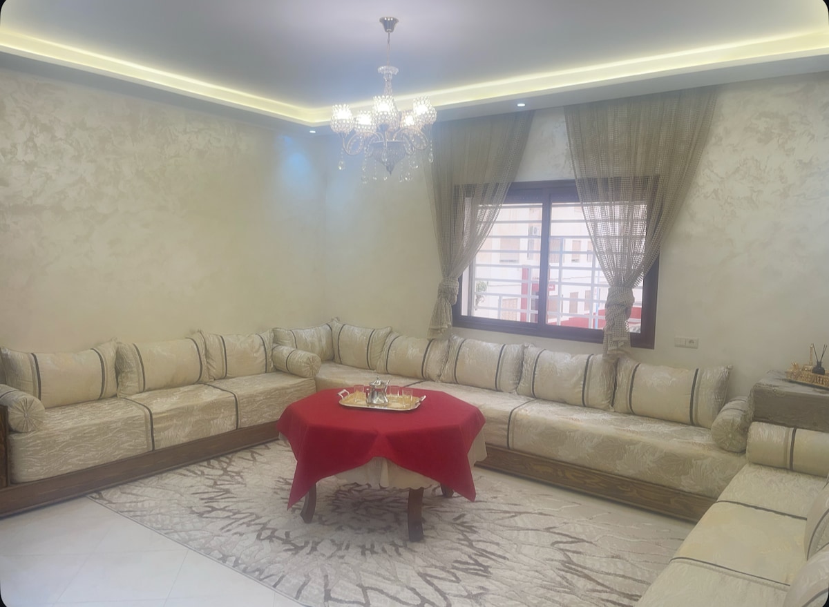 Rustige retraite | Modern | Airconditioning | 15 min strand | Wifi | Netflix | 15 min Adrar Agadir stadion Welkom in ons moderne en nieuwe appartement gelegen in een veilige buurt dicht bij alle voorzieningen. Het heeft twee comfortabele slaapkamers, een chique woonkamer met smart-tv en Netflix, een schone badkamer en een uitgeruste keuken. Je zult de warme sfeer waarderen waardoor je je meteen thuis voelt. Er is🧾 een boekingsfactuur beschikbaar voor je verblijf