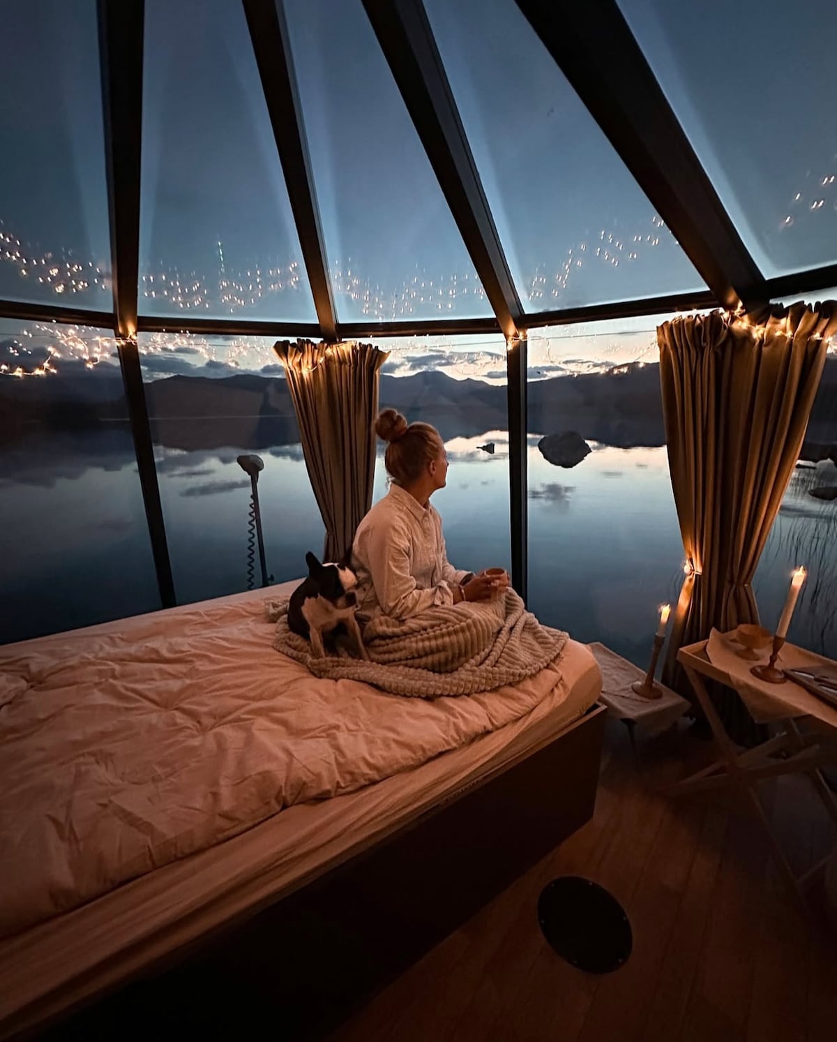 Geniet van het uitzicht vanuit de 'Ørnedomen', een ronde hut van 9 m ² met een bed van 120 cm dat overdag onder het dak is verhoogd. Toegang tot eethoek en kookmogelijkheid in de aanlegsteiger, douche/wc in eigen module. Verhuur van boot. kajaks, SUP en een drijvende sauna. Prijs incl. beddengoed en handdoeken. We hebben ook een café met Thais eten en bier en wijn. OPMERKING - dit is Rangsundøya 81 96 Selsøyvik op 25 minuten varen van Rødøya.