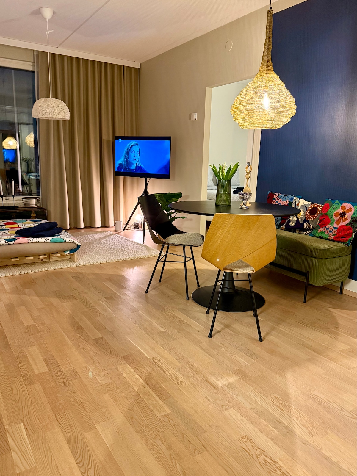 An idyllic artist’s home in the heart of Helsinki, right next to lively Kallio! This bright, spacious home offers water views and sits by a beloved pier for picnics and sunbathing. It features colorful tableware, vintage lamps, and cozy corners for relaxing. The flat has everything you need: a fully equipped kitchen, a private sauna shift, garage parking, bikes, SUP boards, a coffee machine, and an heated-floor bathroom. Restaurants, shops, and urban outdoor trails are just around the corner.