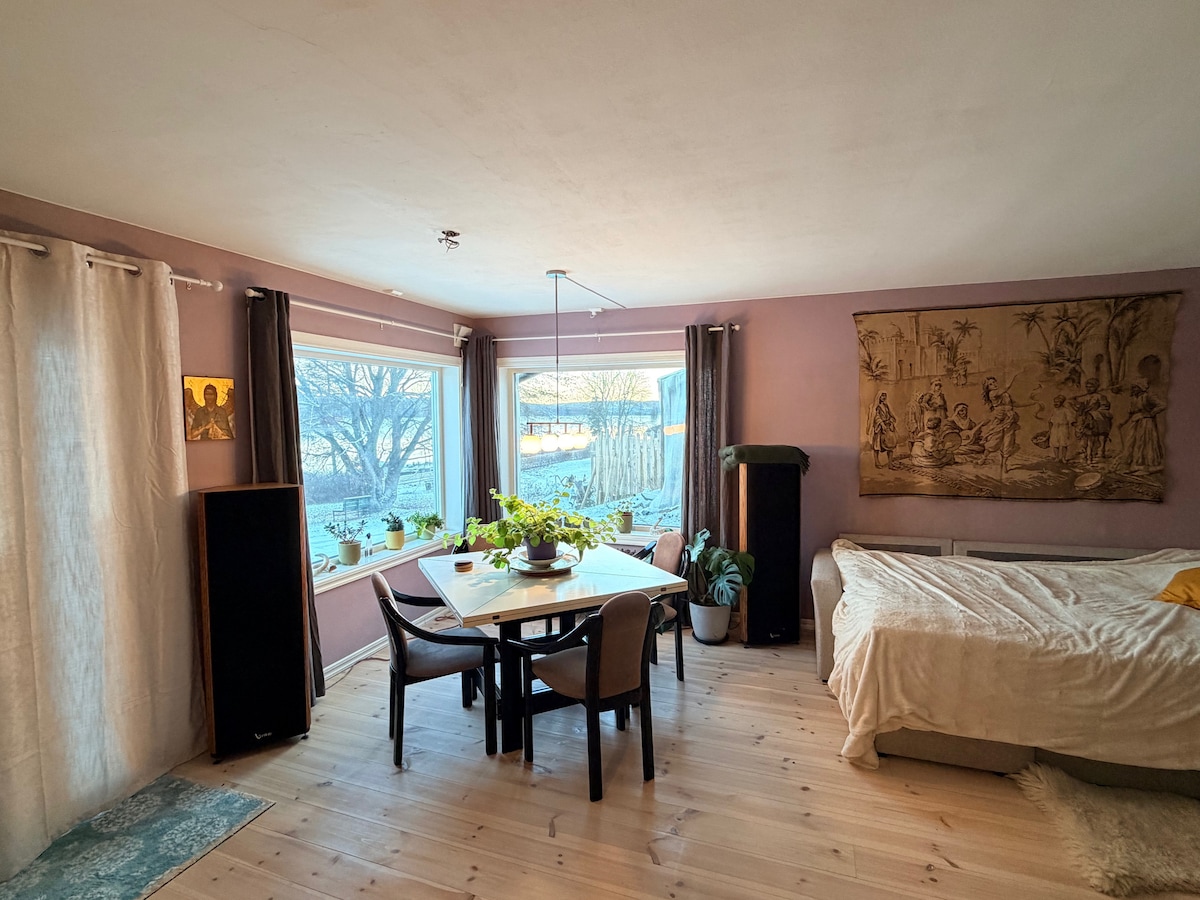 Et nydelig sted for enslige/par som vil ha et opphold i en unik kjellerleilighet rett ved Hurdalsjøen. Utgang rett ut i hagen med Hurdals vakreste tre, frukttrær, frittgående høns, og 50 meter til fin badeplass med strand. Dere kan bruke vår kano eller to kajakker og padle på sjøen, eller bruke stedet som utgangspunkt for det Hurdal har å by på om vinteren. Dobbeltseng i stue (160 cm).