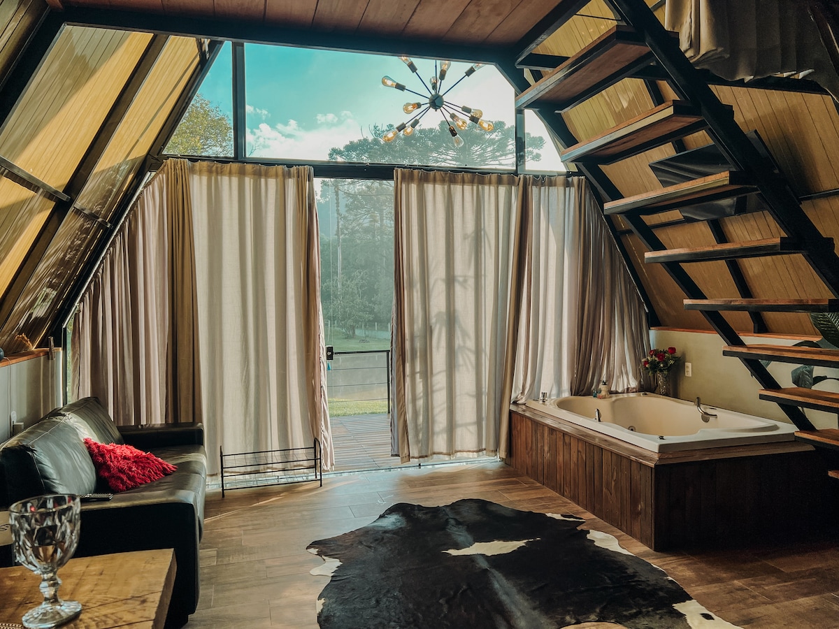 Chalé 2 com hidro, café da manhã, deck com vista.