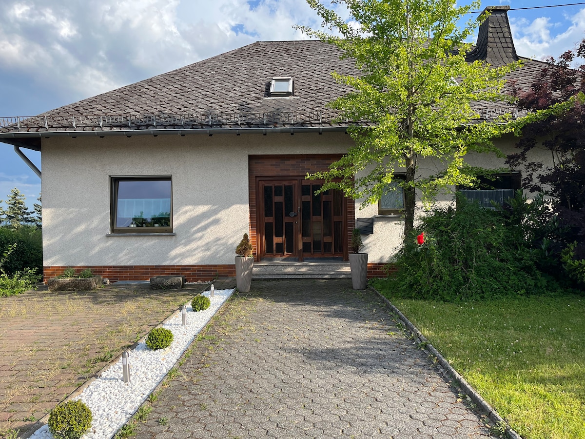 Het houten huis is geschikt voor gezinnen en vrienden met maximaal 10 volwassenen. De accommodatie is gelegen tussen de "Maare" (vulkanische meren) in de vulkaan Eifel in de buurt van de Nürburgring en biedt: Sauna voor 5 personen, 2 wintertuinen, één met een pop-up zwembad, hout verwarmd bubbelbad, vuurplaats, speeltuin, trampoline, fitnessapparatuur in het huis, tafelvoetbal, tafeltennis in de grote dubbele garage, Netflix, wallbox voor elektrische auto 's. 2 baby reiswiegjes en 2 kinderstoelen zijn beschikbaar.