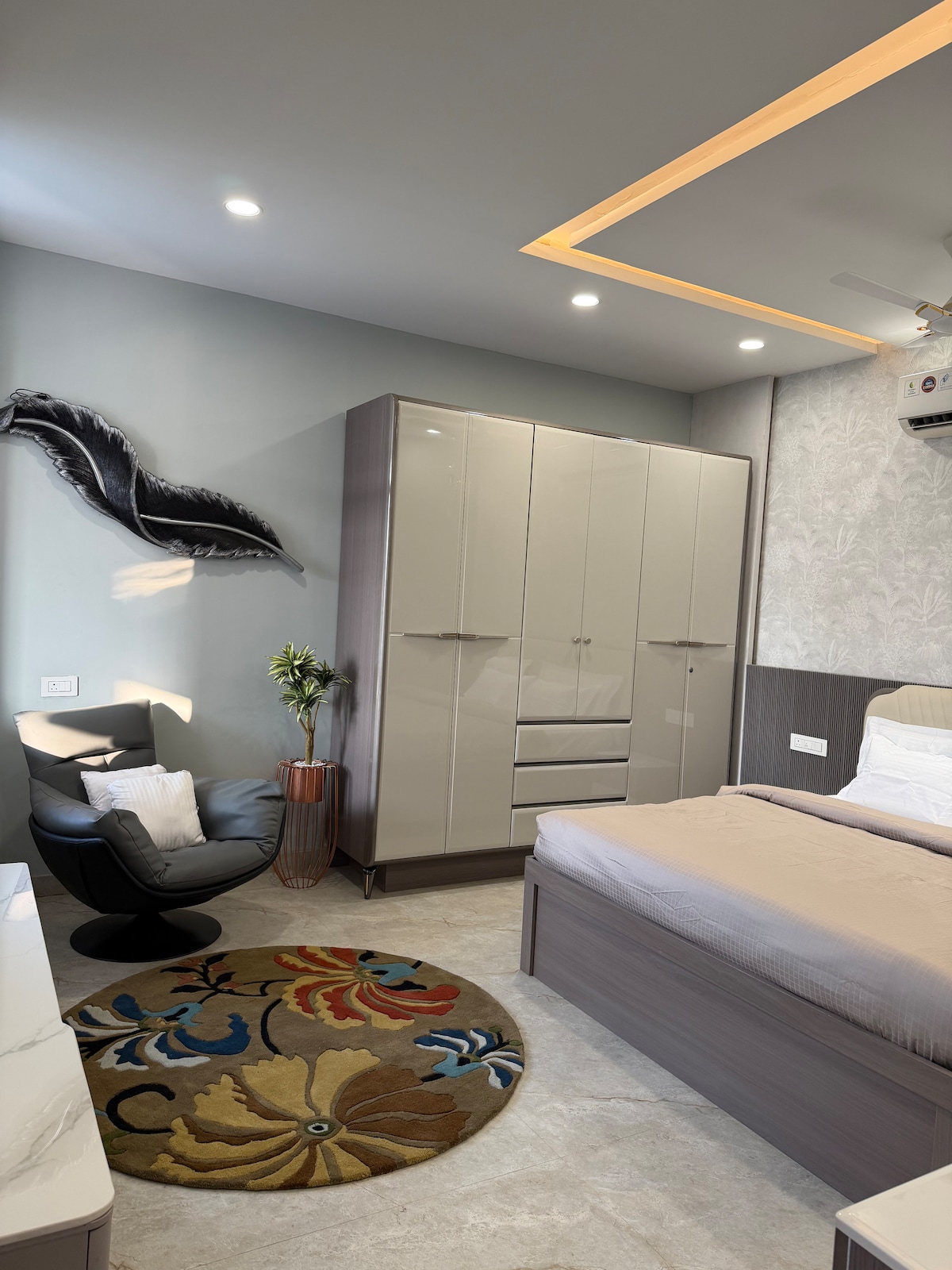 A self check-in, hotel-suite style studio in Vijay Nagar, Indore perfect for couples on a staycation, solo women travellers & working professionals. It has a queen bed, cozy lounge seating, TV, foldable work desk, Wi-Fi & a balcony. Thoughtfully designed interiors & a equipped kitchen, the space gives you the comfort of a hotel and the freedom of a home. 10 mins to Farzi Cafe & Piano Project 10 mins to C21 Mall 25 mins to Airport & Station Ideal for short/long & romantic stays in Indore.