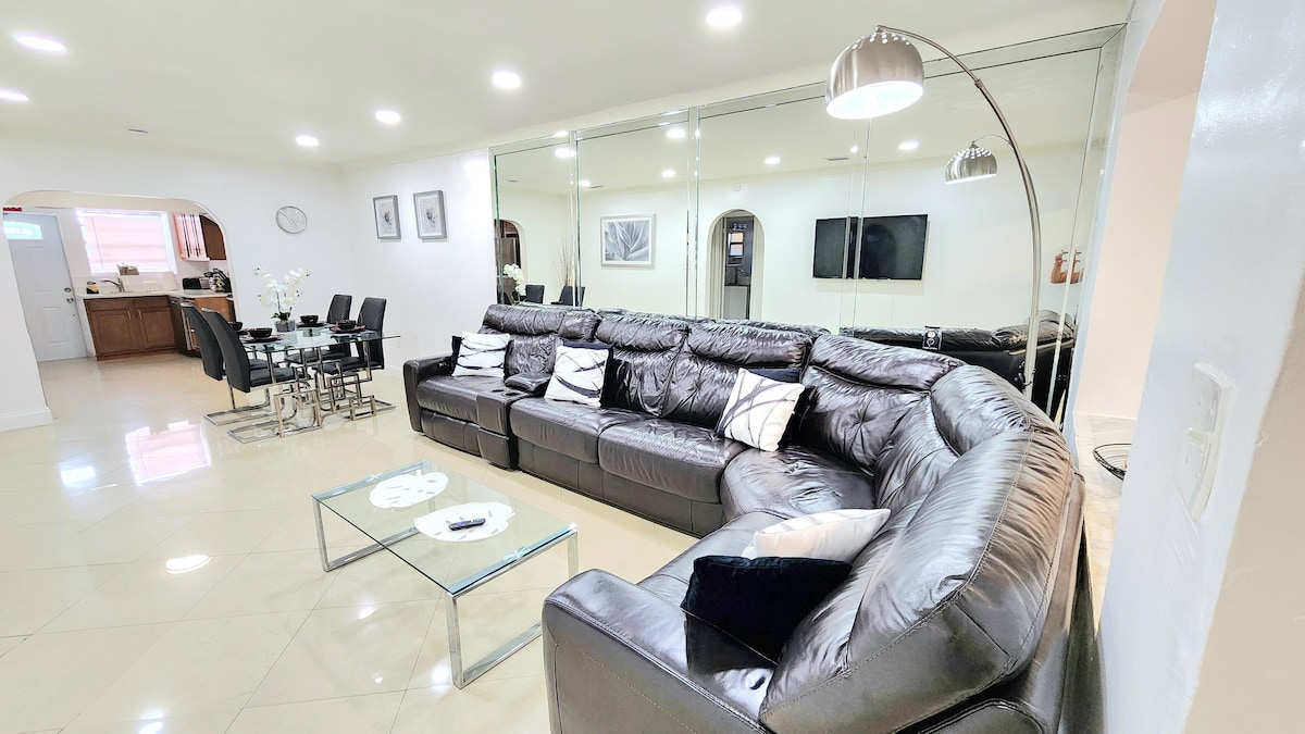 Gerenoveerde villa met 4 slaapkamers in de buurt van Hallandale Beach met nieuw zwembad, bubbelbad en omheinde achtertuin. 3 kamers hebben queensize bedden en de 4e fungeert als een bioscoop/speelkamer met tafelvoetbal en slaapbank. Overdekte cabana met ventilatoren, bank, tv, open haard, grill, ligstoelen en jacuzzi. Binnen: complete keuken, open haard, werkplek, wifi en streaming. Parkeergelegenheid op het terrein, wasserette en huisdiervriendelijke extra kosten. Dicht bij Aventura Mall, Gulfstream Park, Hard Rock Casino en Hollywood Beach Boardwalk.