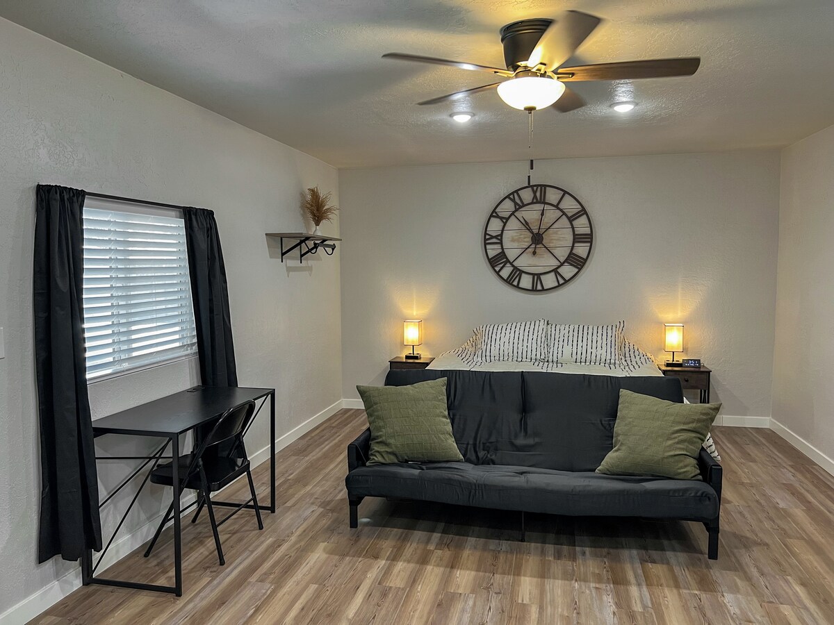 Deze kamer (275 vierkante voet) met een eigen ingang zal je verjongen terwijl je uitrust voor een andere dag plezier in het zuidelijke UT-gebied. Het beschikt over een comfortabel queensize bed, een 42-inch flatscreen-tv,directe tv, Apple TV, eigen badkamer, magnetron en minikoelkast. Deze kamer is de perfecte locatie voor plezier en avontuur, of gewoon ontspannen. Gelegen in de buurt van Snow Canyon, Rocky Vista University en Tuacahn met wandelen, fietsen, kunst, Utah Senior Games, St George Marathon en de Ironman om van te genieten.