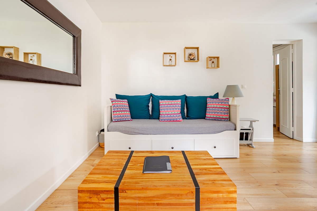 Charmant herenhuis, dicht bij Parijs, in een voetgangersstraat, absoluut stil, 500 meter van de metro en dicht bij alle winkels. Zeer licht, en met een prachtig terras om van de zon te genieten ☀️ Parkeerplaats binnen beschikbaar 🚘 Het huis bestaat uit een woonkamer en een keuken die naar buiten opent, een slaapkamer voor twee personen op de 1e, met een doucheruimte - een slaapkamer voor twee personen op de begane grond, met een doucheruimte - toilet en een kleedkamer met een eenpersoonsbed. Slaapbank is een convertible.