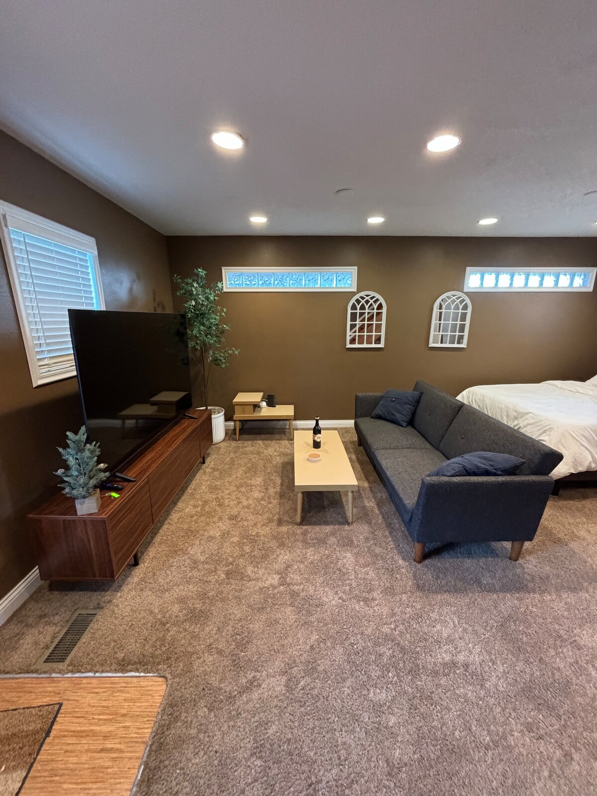 **Veteraan & openbare veiligheidskorting** Ervaar comfort, gemak en luxe in onze charmante gastsuite. Pluche queensize bed, dressoir, smart-tv, wifi, gezellige bank, massagestoel, in hoogte verstelbare salontafel, minikoelkast, Keurig, magnetron en en-suite badkamer met een douche. Eigen toegang, gratis parkeren en huisdiervriendelijk. In de buurt van bezienswaardigheden: stad tennis- en picklebalvelden, restaurants, arboretum, brouwerij, speedway en meer. 30 minuten naar Adventureland. Reserveer nu voor een comfortabel verblijf!