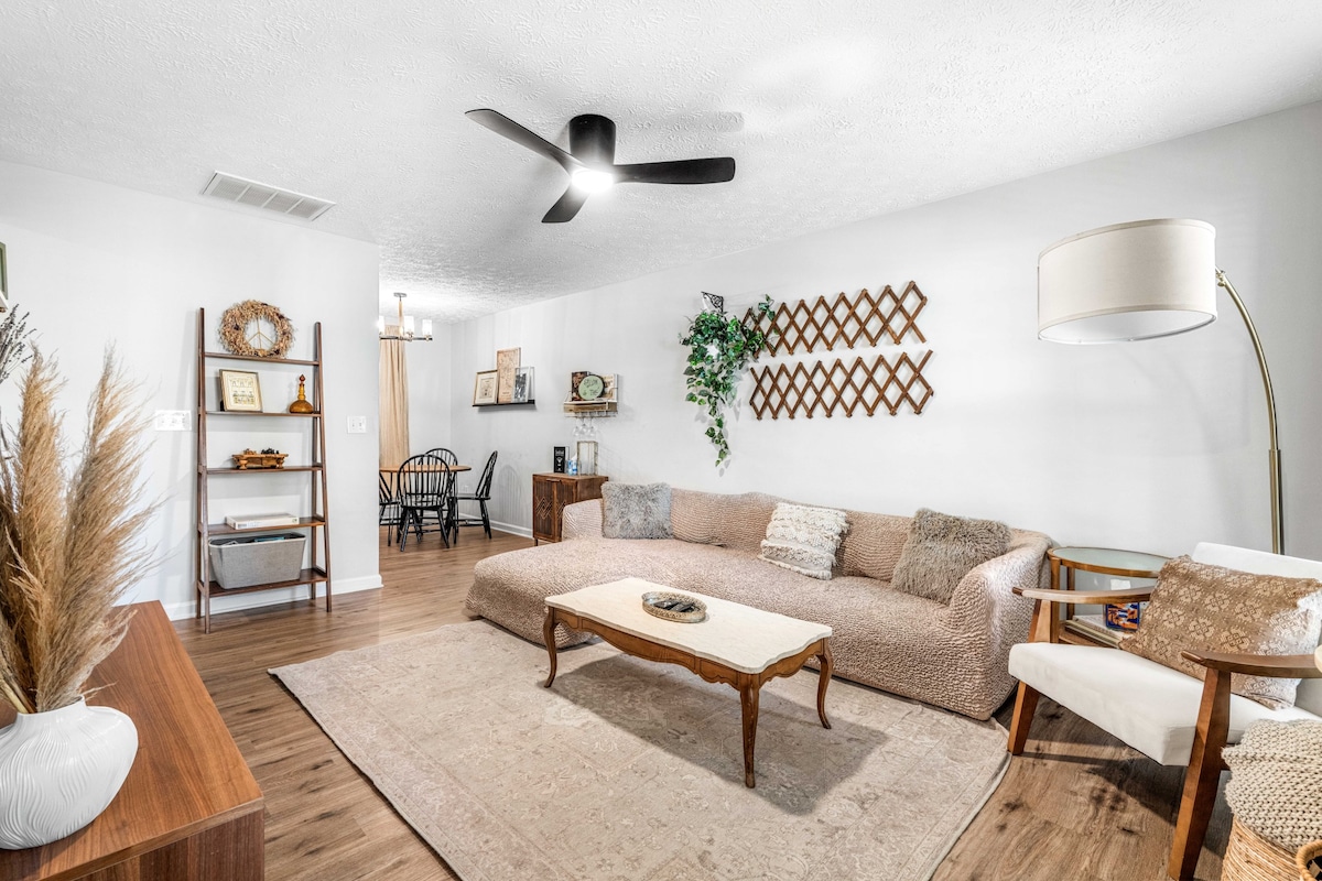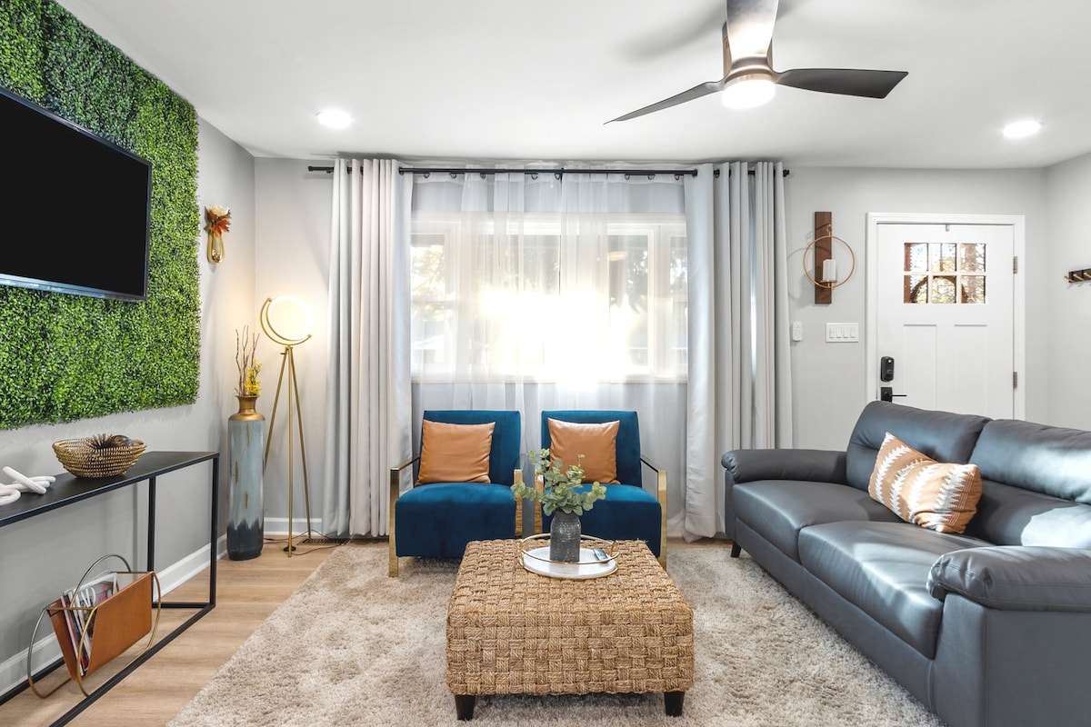 Deze unieke ranch ligt op 3 mijl van het centrum van Raleigh. Stijlvol, modern, comfortabel, schoon, rustig, je thuis weg van huis. Binnen heeft Primary br een comfortabel kingsize bed, een bureau en een stoel. De 2e slaapkamer heeft een comfortabel queensize bed, 3rd br heeft twee comfortabele eenpersoonsbedden. De badkamer heeft een Bluetooth-luidspreker/ventilator om muziek af te spelen terwijl je je voorbereidt op je plannen. Snelle wifi en smart-tv 's/. Koffie is beschikbaar om te maken terwijl je de veranda of drijvend terras ontspant. Je zult het GEWELDIG VINDEN @ the Noliahouze!
