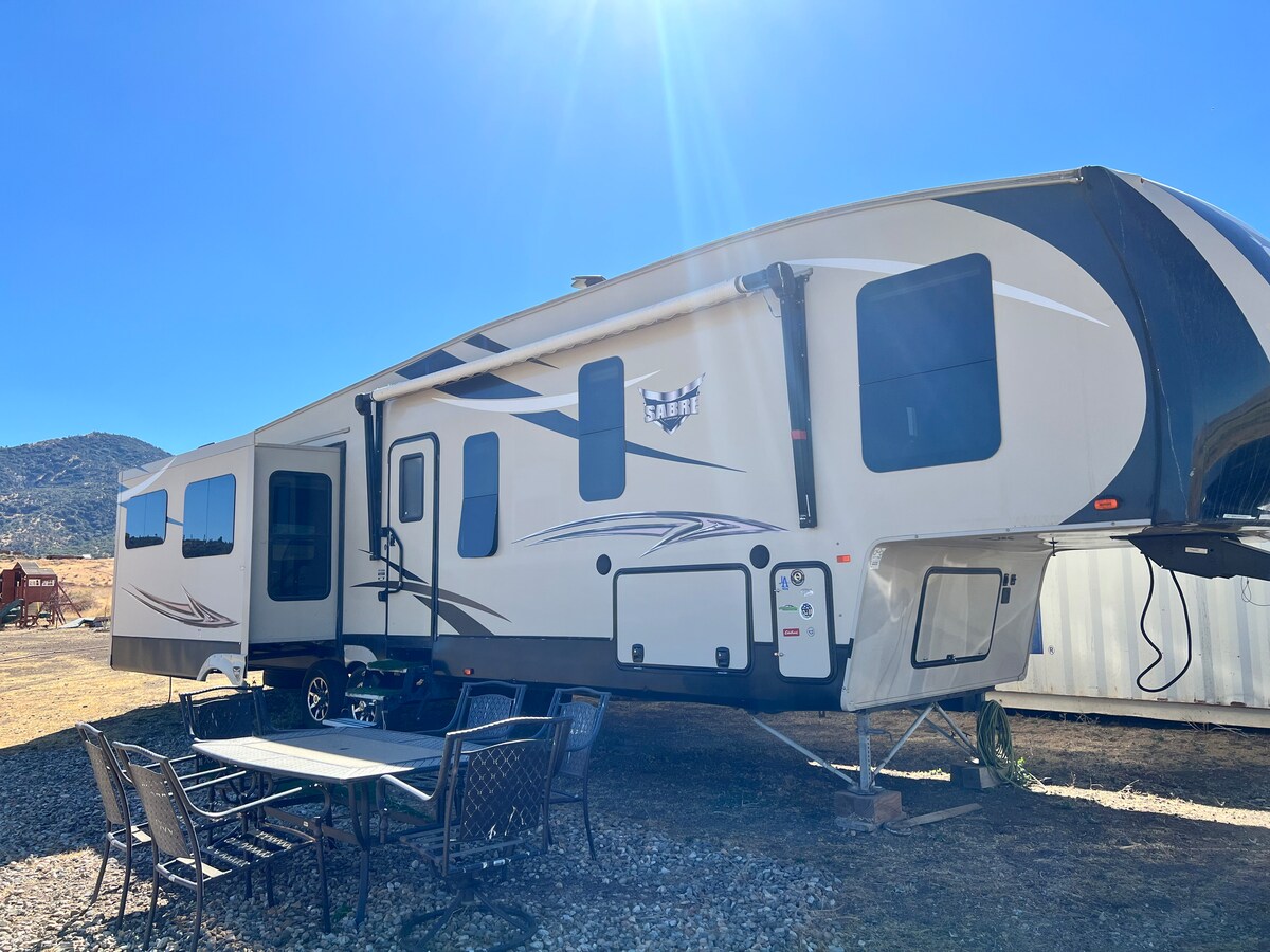Deze accommodatie ligt op 1 mijl van een onverharde weg. De weg kan steil en hobbelig zijn op sommige plekken . We hebben hier meer dan 1200 mensen zonder problemen gehad. Dit is slechts een disclaimer, dus je weet het voordat je reserveert. Helder en ruim nieuwere 34 voet vijfde wiel met vier glijbanen die 4 comfortabel slaapt. Volledige keuken, evenals een bbq-ruimte. Propaanvuurplaats ingericht om te genieten van de geweldige uitzichten, of stargaze. Rustig en afgelegen met prachtig uitzicht op het meer van Isabella. Op enkele minuten afstand van bergen, meer en rivier.