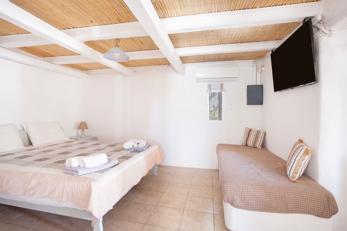 Blu studios are conveniently situated on a hill side, overlooking the bay, a 5 minute drive from the port. 6 new studios, with queen beds, showers and adjoining W.C.s, built and decorated in the traditional island style. Air-conditioned, equipped with T.V. sets, refrigerators, hair dryers coffee makers and other small appliances. Breathtaking view, big 130 sq. meters pool, peaceful, away from public roads, easy access to the island's beaches and villages. Ideal for couples. Adults only.