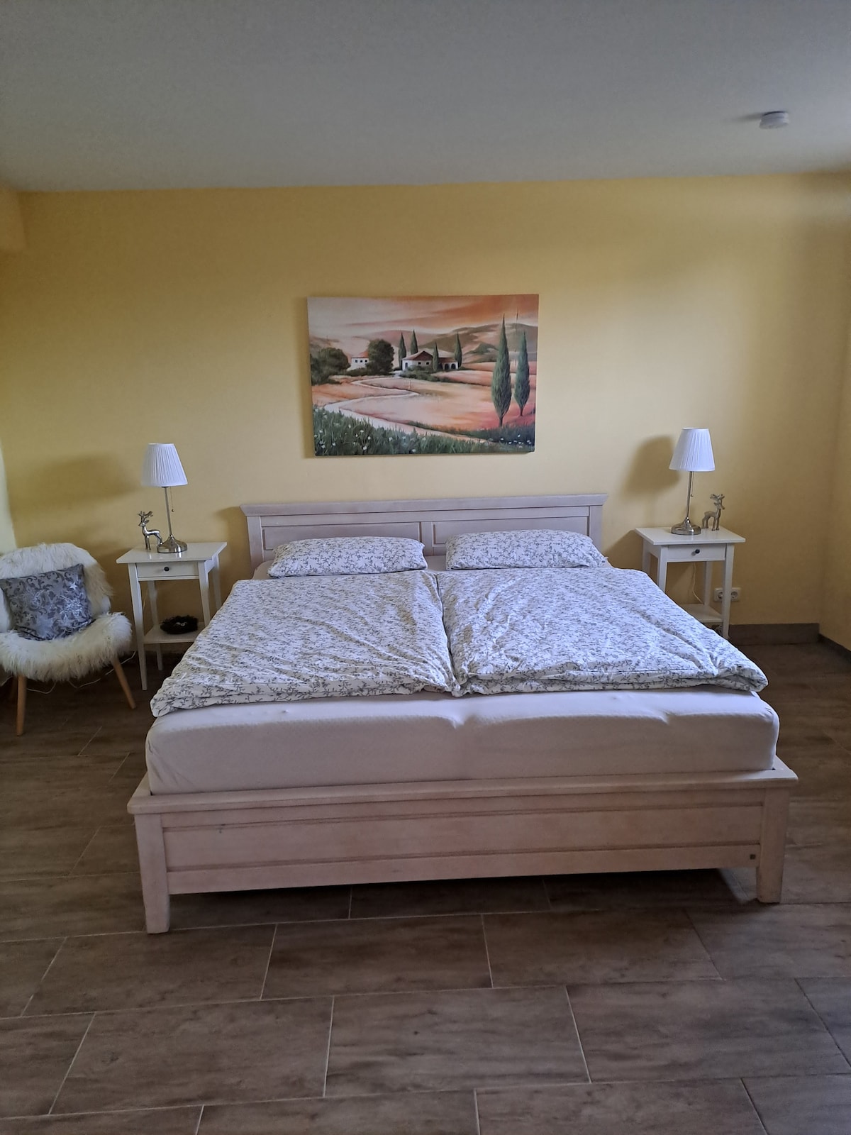 Appartement op de 1e verdieping met 3 slaapkamers, een badkamer met douche en een kleine keuken - in totaal 50m2. Inclusief wifi, Netflix-tv en gebruik van een wasmachine en een wasmachine mogelijk. Met nieuwe airco 's (airconditioningunits) in elke slaapkamer, op zonne-energie 🌞 (klimaatneutraal). We wonen op de 1e verdieping met ons kind en hond Chili. Openbaar vervoer naar Frankfurt met de bus en S-Bahn (naar het centraal station van Frankfurt ongeveer 50 minuten). Bekijk ook de huisregels voor meer informatie.