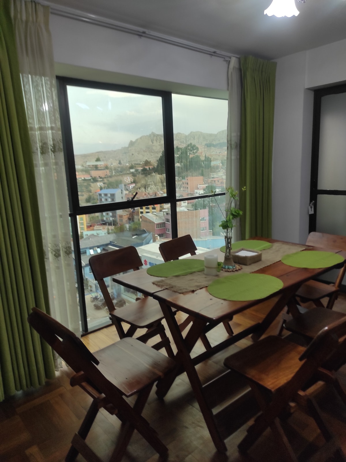 Penthause exclusivo con vista panorámica inigualable del "Illimani" y la ciudad. - Ubicado en el corazón de Sopocachi, cerca de supermercados, restaurantes y trasporte público. - Wifi 5G - Cocina independiente, Nexflix, lavadora y agua caliente. - Acceso seguro y privado con ascensores panorámicos y seguridad 24/7 1. Habitación principal cama QUEEN para 1 o 2 personas Dólares 38 (la segunda permanece cerrada) 2. Segunda habitación (opcional) cama doble disponible por 8 dólares por persona.