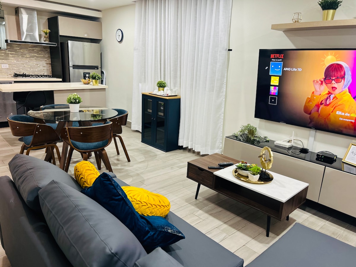 Luxurious and modern apartment with: Room, living room, dining room, laundry area, air conditioning, parking, swimming pool, social area and security camera. Flexible in arrival times and easy access to public transport. You will feel in a safe and warm environment, surrounded by elegance and above all concerned with disinfecting each area and element. "Your health is paramount to us."