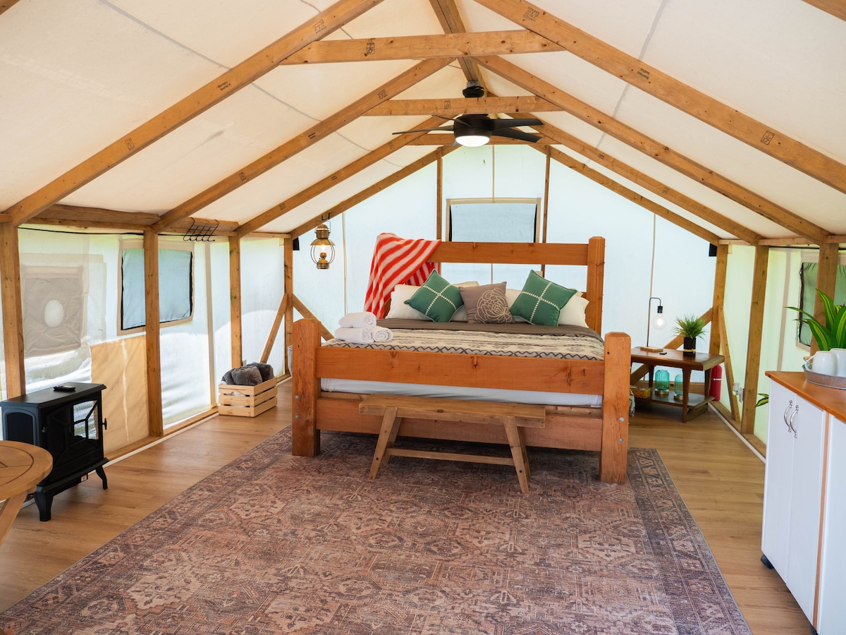 Escape to your own Glamping Tent retreat, nestled on a sprawling property shared with a small community of like-minded nature lovers. This charming tent is perfect for two, offering a cozy and stylish getaway. Whether you're seeking a romantic escape or a peaceful recharge in nature, this glamping tent offers the perfect blend of adventure and comfort. Wake up to birdsong, spend your days exploring the property, and end each evening cozied up by the fire—your secluded nature retreat awaits.
