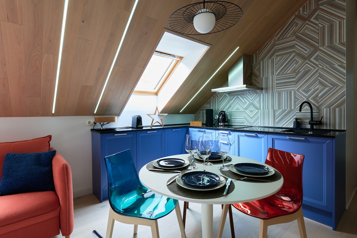 Luxe appartementen met terras en auteursontwerp gelegen in het hart van de oude binnenstad van Riga. De omgeving is doordrenkt van de romantische geest van de oude stad en is een van de oudste in Riga (13e eeuw). Het appartement (~50 m ² + terras 16 m ²) is gelegen in een historisch 3 verdiepingen tellend gebouw, op de derde etage. Perfect voor zowel een stel als gezin, met een maximale bezetting van 4 personen. Slaapplaatsen: 180x200 bed, opvouwbare bank in de woonkamer 140x200.