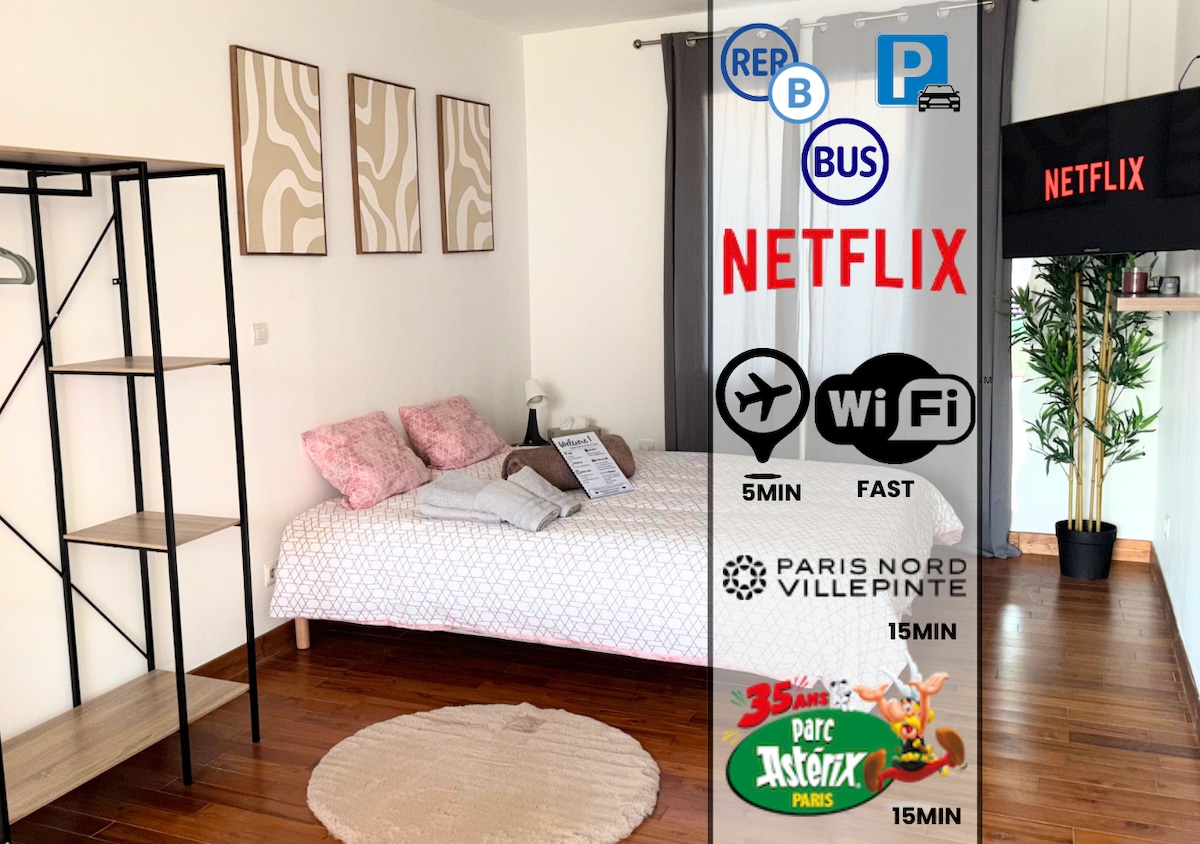 Gemiddelde beoordeling van 5 op 5, 6 recensiesKleine cocon met parkeerplaats inbegrepen, 10 minuten van CDG