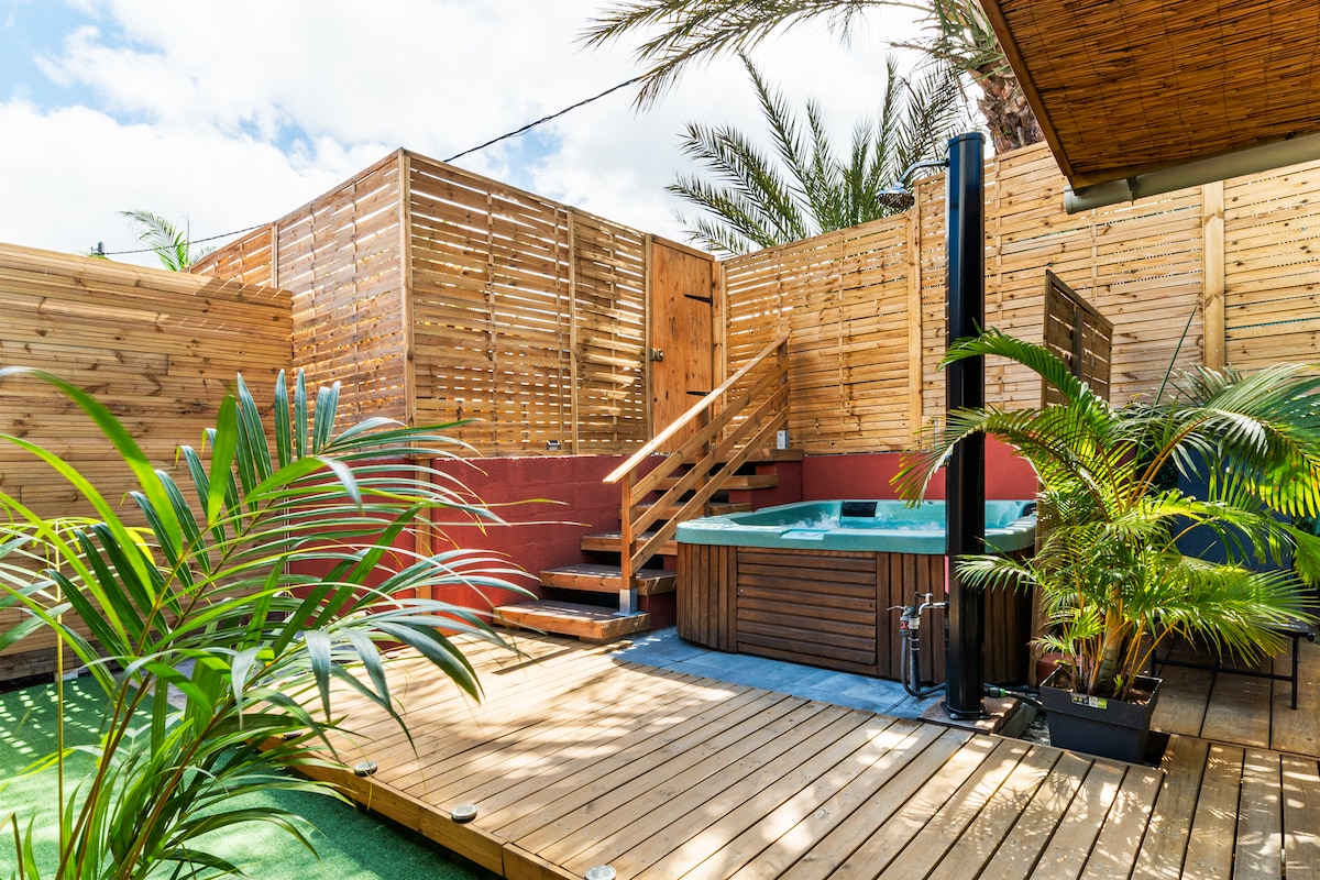 Logement proche de la plage accessible à pieds, equipé d'un jacuzzi privatif avec vue mer et montagne depuis le jacuzzi. Il est au premier étage. Profitez d'une situation exceptionnelle proche du lagon. Fêtes interdites. Le jacuzzi est accessible à toute heure, cependant les buses de massages sont programmées jusqu’à 21h et reprennent à 8h. TARIF DÉGRESSIF SELON DURÉE