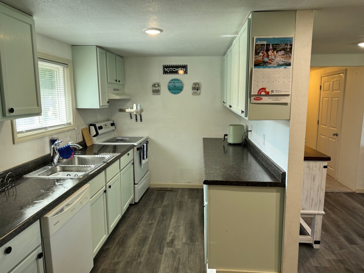 Dit gezellige huis heeft zoveel te bieden met slapen voor 4 tot 8 en zou meer ruimte kunnen bieden met de pack-and-play. Kingsize bed is geschikt voor twee grote bedden en twee slaapbanken op ware grootte, elk voor één of twee personen. Extra dekens en kussens in de kamers. Dicht bij shopping, banken, eetgelegenheden en het gemeenschapstheater. Parkeerplaats buiten de straat of achter het huis met zowel de ingang van de voor- als achterdeur. Grill, vuurplaats en schommel achter. Niet roken, geen feestjes. Geweldige plek om tot rust te komen en van te genieten.