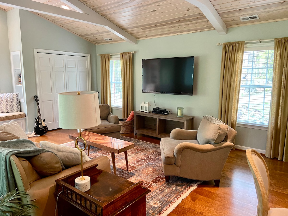 Loop een royaal ruim, open concept-appartement binnen. Het comfortabele meubilair in deze woning combineert authentieke stijlen met modern design. Begin je ochtenden met een zorgvuldig schone badkamer. Geniet van filmavond in de grote woonkamer of lig op het comfortabele kingsize bed. Lees de nacht door bij een hartelijk fornuis. Verblijf in de achtertuin en geniet van de sereniteit van Sykesville! Geniet van het snelle internet en de grote ruimte voor je thuiswerkbehoeften. Verblijf in de tijd en maak van de plek jouw huis.