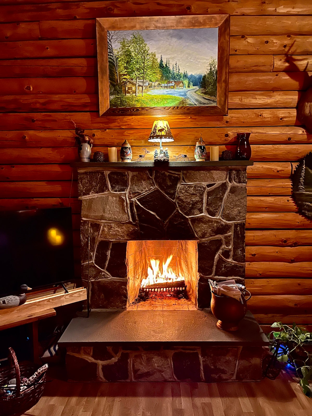 Rustieke blokhut #6 - "Fireside" is een romantische blokhut die een van de twee hutten aan de andere kant van de Zalmgatbeek is. De veranda van een boer kijkt uit op de beek en de vuurplaats. Een kingsize bed met plafondventilator en loveseat bevinden zich voor de open haard van veldsteen. Uw keuken maakt de studio-stijl blokhut compleet. De badkamer heeft een tweepersoonshoekjacuzzi en een douche.