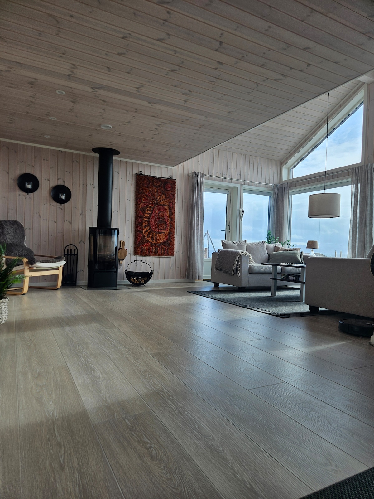 De hut is groot en modern. Grote ramen laten de natuur binnen. Het kijkt uit op de Vestfjorden en heeft een schitterend uitzicht. Na een goede wandeling kunt u ontspannen in een ruime sauna met een panoramisch raam of u de warmte van de houtkachel laten verwarmen. Twee van de slaapkamers hebben een zeer hoge standaard waar je kunt genieten van het uitzicht, ofwel richting de bergen in het oosten of richting de bergen in het westen. De hut heeft een grote loft woonkamer met tv. Hier kun je films kijken of je eigen spelcomputer aansluiten.