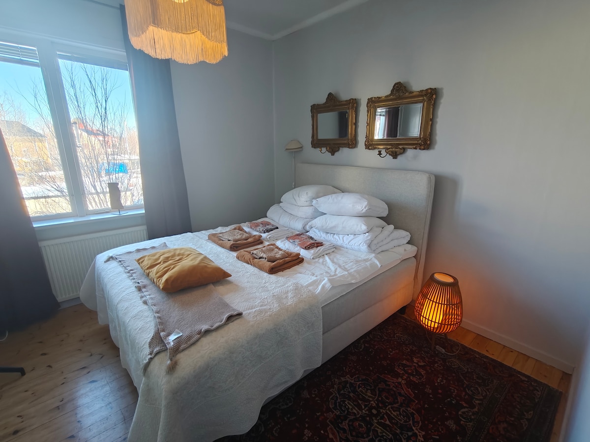 Vi erbjuder en ljus och nyrenoverad vindsvåning på ca 30 kvm. Lägenheten är inredd med de bekvämligheter som krävs för ett bekvämt boende för upp till två personer. Mysigt kök med ny kyl/frys, spis och ugn samt micro med köksartiklar. Nyrenoverat badrum. 160cm säng, sittsoffa samt en fotölj. 55" smart TV, WIFI. Lägenheten har smidigt kodlås för er bekvämlighet. Gästen ansvarar för städning innan utcheckning. Er host bor i samma hus och är tillgängliga vid frågor.