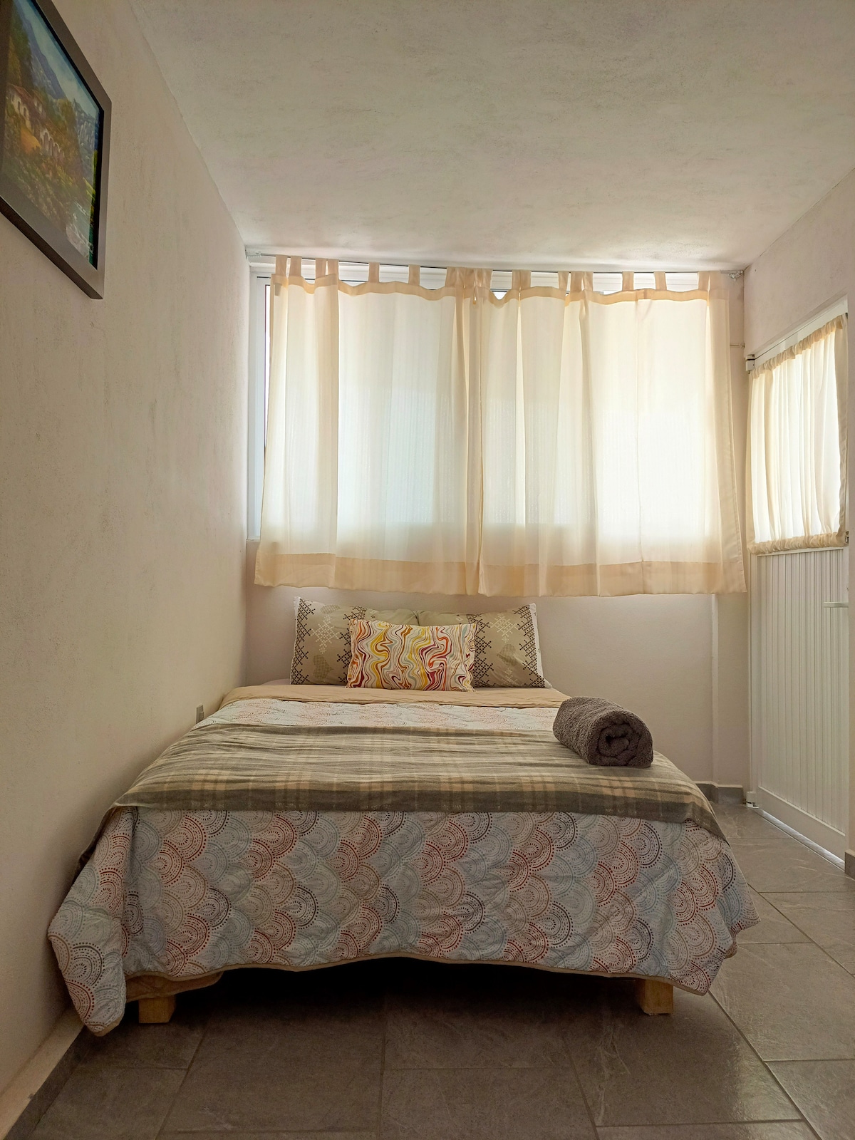 Departamento completo ideal para disfrutar tu estancia en Qro. Habitación muy amplia, cuenta con mini split, TV, clóset, 2 silloncitos y un espejo de cuerpo completo. La cocina está equipada con: parrilla eléctrica, microondas, licuadora, cafetera, refrigerador, vajilla para 4 personas, y accesorios básicos para uso de la cocina. 1 baño completo (se utilizan paneles solares para el agua caliente), incluye: jabón para manos, shampoo, jabón corporal, toallas, secadora p/cabello y plancha p/ropa.