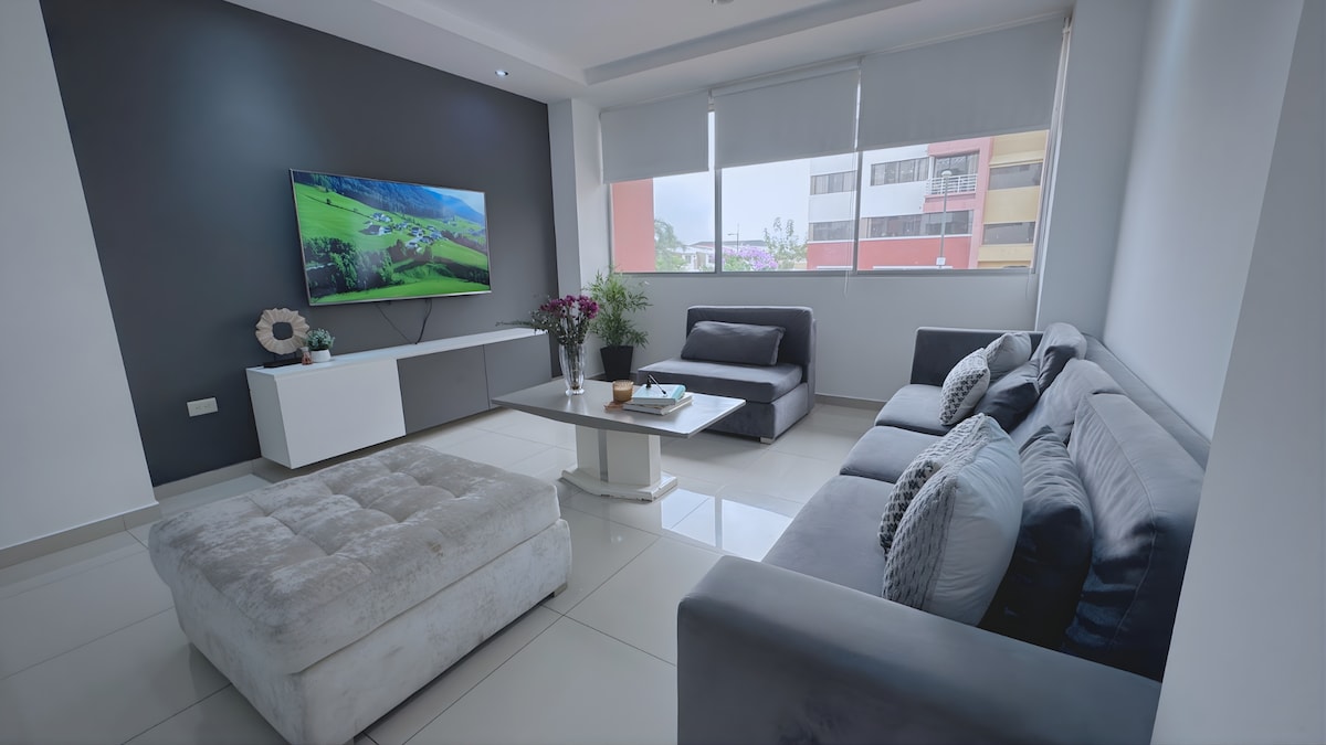 Modern minimalist-style apartment in Samborondón, located in a privileged area with 24/7 private security. Ideal for families or executives seeking comfort and tranquility. Right in front of El Dorado Mall. It features 3 bedrooms, each with a TV with Netflix and air conditioning. The living room includes a 65” TV. You also have 100 Mbps high-speed internet, perfect for working comfortably and enjoying a practical, relaxing stay.