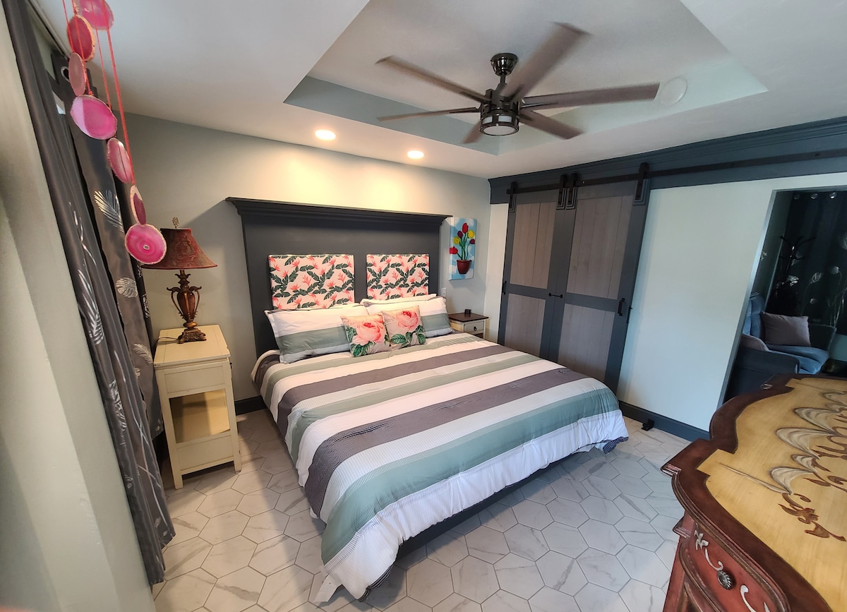 1.100 vierkante meter, volledig gerenoveerd, 1 slaapkamer met inloopkast. Grote badkamer met twee wastafels en een inloopdouche. Open concept woonkamer, eetkamer en keuken met gewelfd plafond. Hardhouten vloeren. Centrale lucht. Appartement is verbonden met een hoofdgebouw maar zonder toegang tot het interieur tussen huis en appartement. (Helemaal geen binnenverbindingsdeuren) Het heeft een eigen oprit en zijtuin. Rif tank zal niet meer in het appartement zijn na 20 mei.