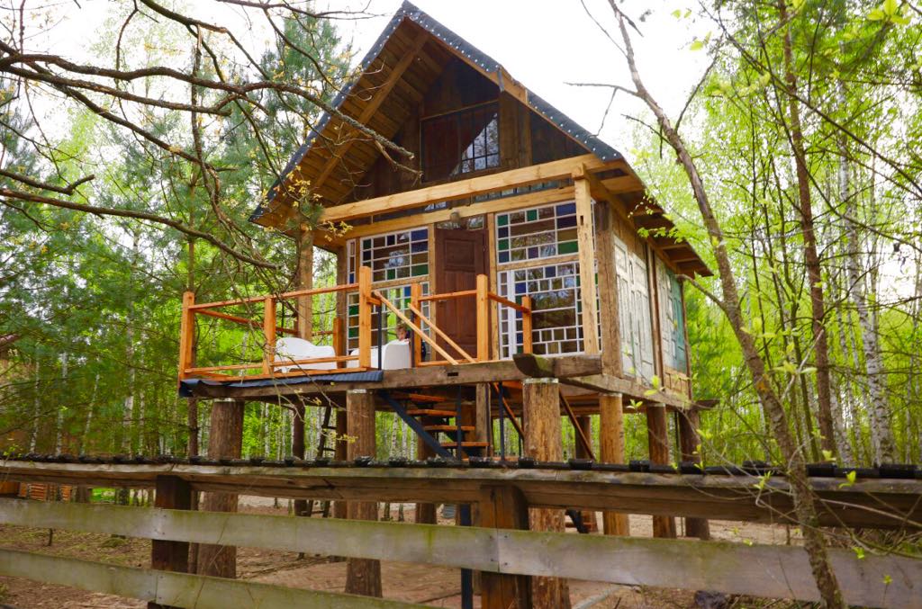 Unieke boomhut. Gebouwd op houten palen veroorzaken dat je leeft in de kroon van bomen. Gelegen in de hoek van het bos, op de boerderij Dworek Aleksandrówka. Oppervlakte 22,5 m2, mezzanine, keukentje, badkamer. Terras met een oppervlakte van 7 m2 met uitzicht op de bosmuur. Het decor is een mix van een jachthut en een loft. Meubilair met origineel ontwerp. Uitrusting : draaitafel, verrekijker, boeken, bordspellen, dvd-video 's.