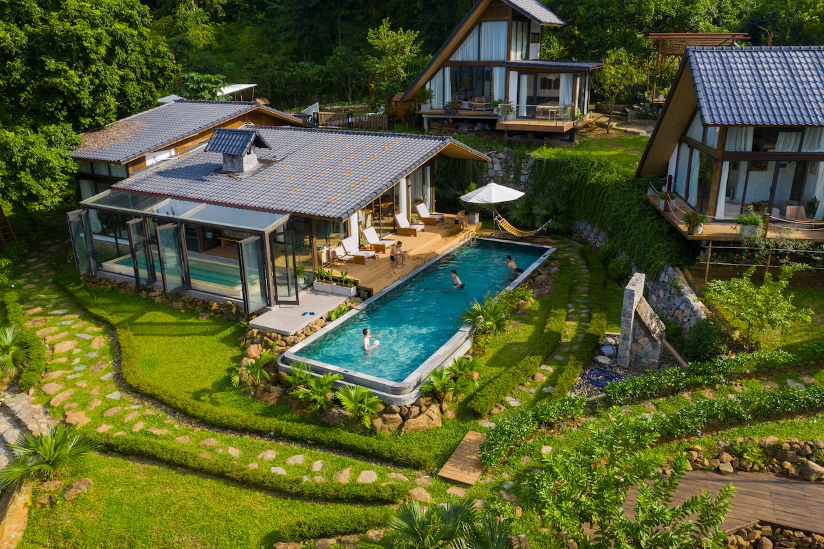 Ẩn mình giữa thung lũng Cư Yên, Solmist Villa rộng 4.300m² mang đến không gian nghỉ dưỡng riêng tư, kết hợp sự mộc mạc và tiện nghi hiện đại. Hồ bơi trong xanh, bãi cỏ rộng, tầm nhìn núi non hùng vĩ – tất cả tạo nên một kỳ nghỉ yên bình, lý tưởng cho gia đình, nhóm bạn và team building.