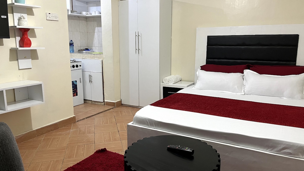 Kb ventures Home is a serene modern well furnished one bedroom which offers a homely feeling away from home. It has a fully equipped kitchen,Fresh water is available. Self check in. It’s situated about 20 minutes from the airport(depending on traffic) Nyayo estate is a gated community with 24hrs security. We have secure parking spot on the property. Shopping center is available on site. I welcome you to feel at home and make memories in this amazing apartment.