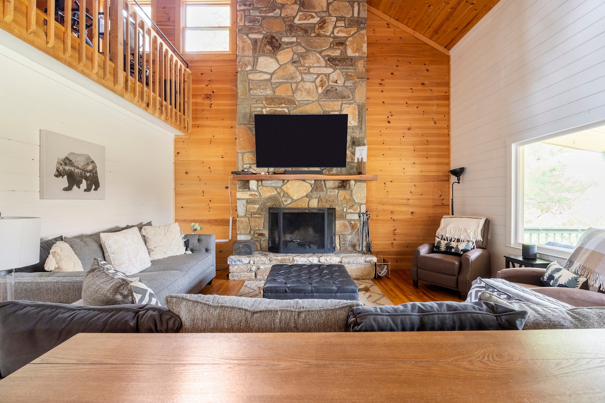 Riverside Relaxer, 2BR 2-bad huisje met uitzicht op de Little Tennessee River. De Relaxer biedt een groot dek rondom met buiten dineren,vuurplaats, hangmat,bubbelbad,balkon en grill met uitzicht op de rivier. Gloednieuwe en professioneel ingerichte interieurs, goed uitgeruste en volledig gevulde keuken, gashaard, bovensuite met bad en balkon. LRG screen TV 's in alle woon- en slaapkamers . Snelle wifi, gemakkelijke toegang en dicht bij alle West-NC-steden en -steden. Gezins- en huisdiervriendelijk. Niveau 2 EV-oplader. 6 slaapplaatsen.