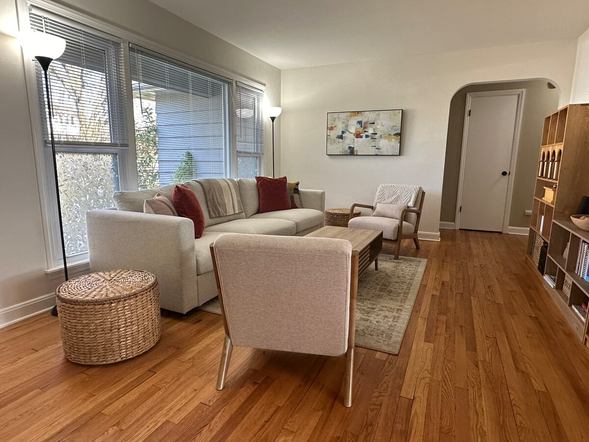 Volledig gerenoveerde, zonnige en ruime bungalow in een gunstig gelegen woonwijk. Onlangs gerenoveerd voor jouw plezier. Grote woonkamer, eetkamer en complete keuken. Twee slaapkamers - een queensize bed, een groot bed en een queensize slaapbank. Er is wifi, kabel en Roku TV. Kind- en gezinsvriendelijk, met apparatuur en speelgoed voor de allerkleinste. Snelle en gemakkelijke toegang tot de belangrijkste wegen en snelwegen. 5-10 minuten van de campus en het centrum, 15 minuten van Epic.