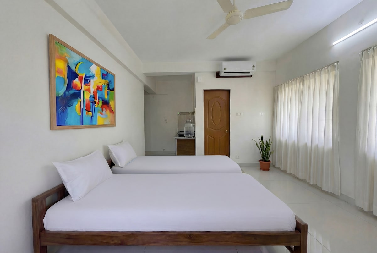 Ons RUIME 3BHK-appartement ligt midden in de stad in een rustige woonwijk en is ideaal voor GEZINNEN met KINDEREN en GROEPEN die naar Mangalore reizen. Het appartement heeft zeer goede cross-ventilatie en licht. Het ligt op slechts 5 minuten lopen van de bushalte van de stad, auto-stand en op 12 km van de luchthaven. Ola/Uber-taxi 's komen naar de deurstap. De plaats ligt in de buurt van de markt, restaurants, supermarkten, winkelcentrum, enz. De meeste restaurants hier hebben een thuisbezorgingsfaciliteit.