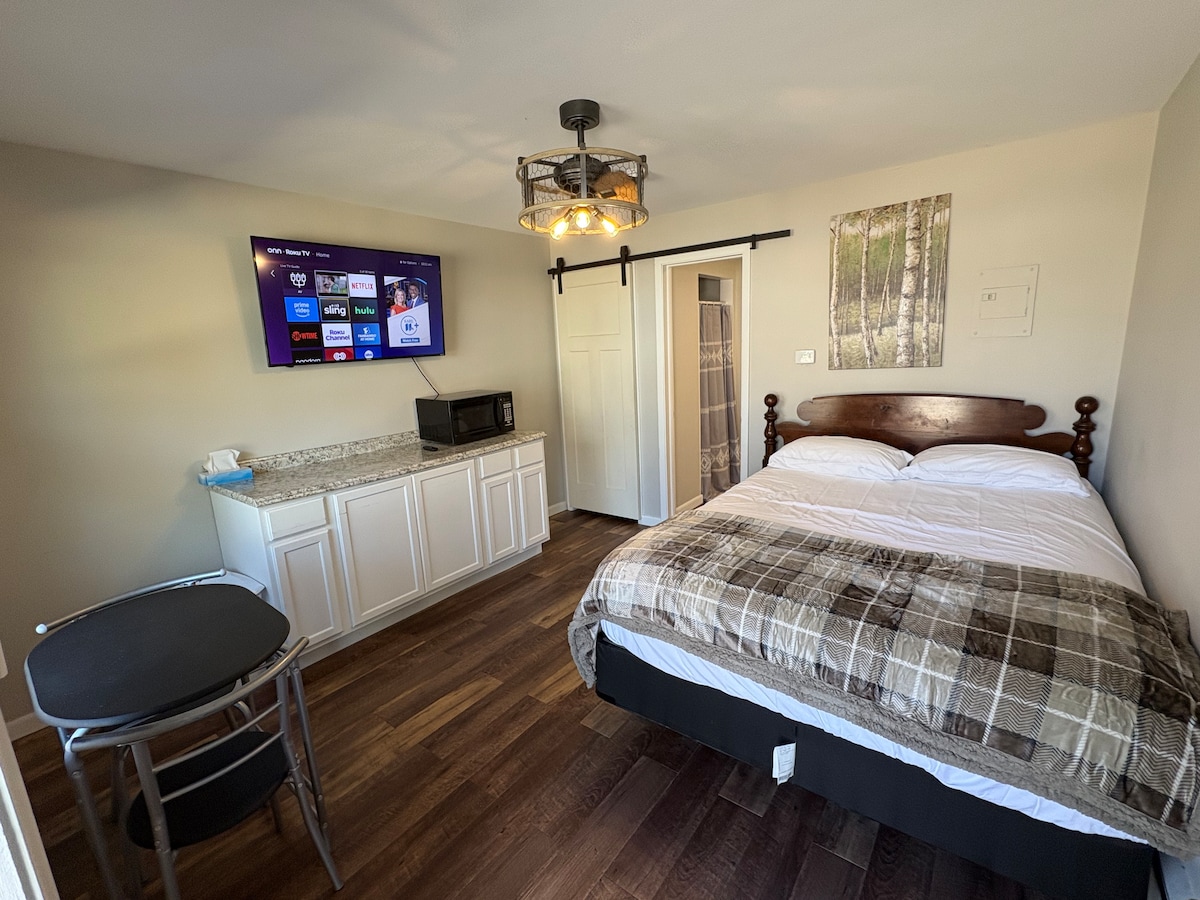 Welcome to Lodging at Lake Aire in the charming community of Waseca Mn. This is a room in our extended stay Motel. The 3 acre property and views of clear lake are sure to please. This studio has a refrigerator, microwave, toaster and Keurig style coffee pot. This unit features a new full sized plush soft bed with all new pillows and linens. The private bathroom has a stand up tile shower, soaps & all new towels. There is also a semi private concrete patio overlooking the 3 acre property.