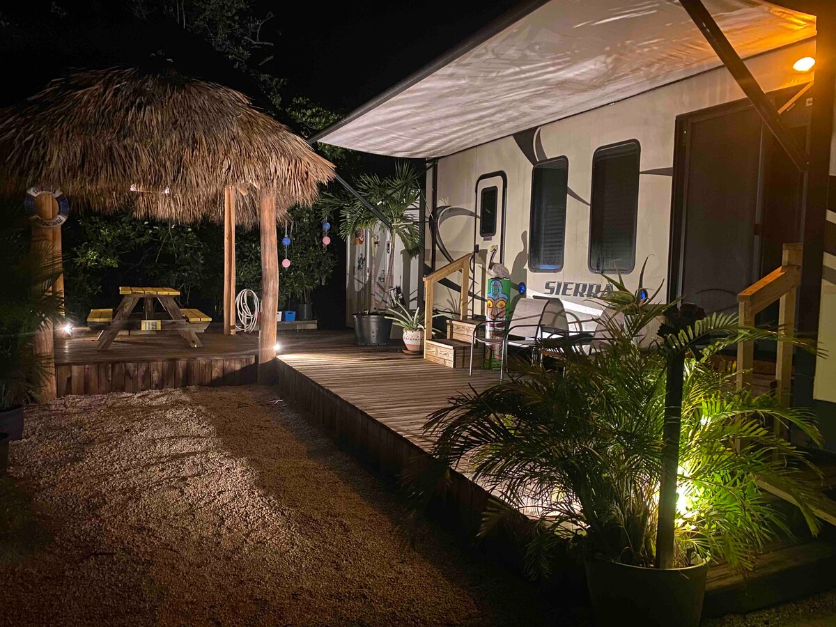 WERKELIJKE LOCATIE: binnen KeyLargoKampground.com Gated Community Lot #66 met AANLEGSTEIGER voor 25' BUITEN: ~ Groot dek/ dok, grill, zwembadder, tikihut met schommel en eettafel en pubtafel. Parkeren voor 1 vrachtwagen & 1 auto. ~ stappen van het huisje Dok in 30' diep 100' breed diep water zwemkanaal met tropische vissen langs de oevers, af en toe Manatee, tarpon en finger mullet in koelere maanden. Misschien een bruinvis. Kayack, board of Fish off dock. Loop naar maanverlichte stranden op het park.