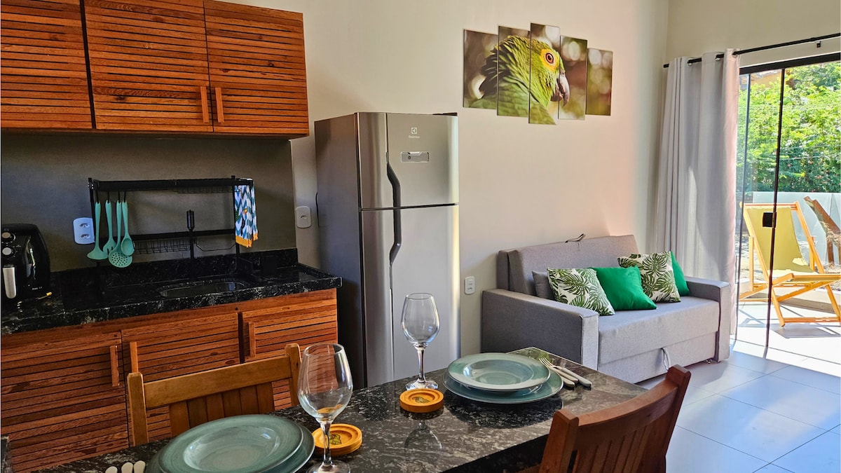 Suíte com ar condicionado, wifi, frigobar , piscina, redes e área verde 5 minutos da praia e 900 metros da vila de Barra Grande. Um Paraíso das mais lindas praias, dentre elas as piscinas naturais de Taipu de Fora, Ponta do Muta, entre passeios de quadriciclos e lanchas. Temos um espaço comum com fogão, geladeira, pia e utensílios básicos de cozinha, para você mesmo preparar seu café da manha e outras refeições. O espaço possui todos os itens de higienização conforme protocolos Airbnb e local