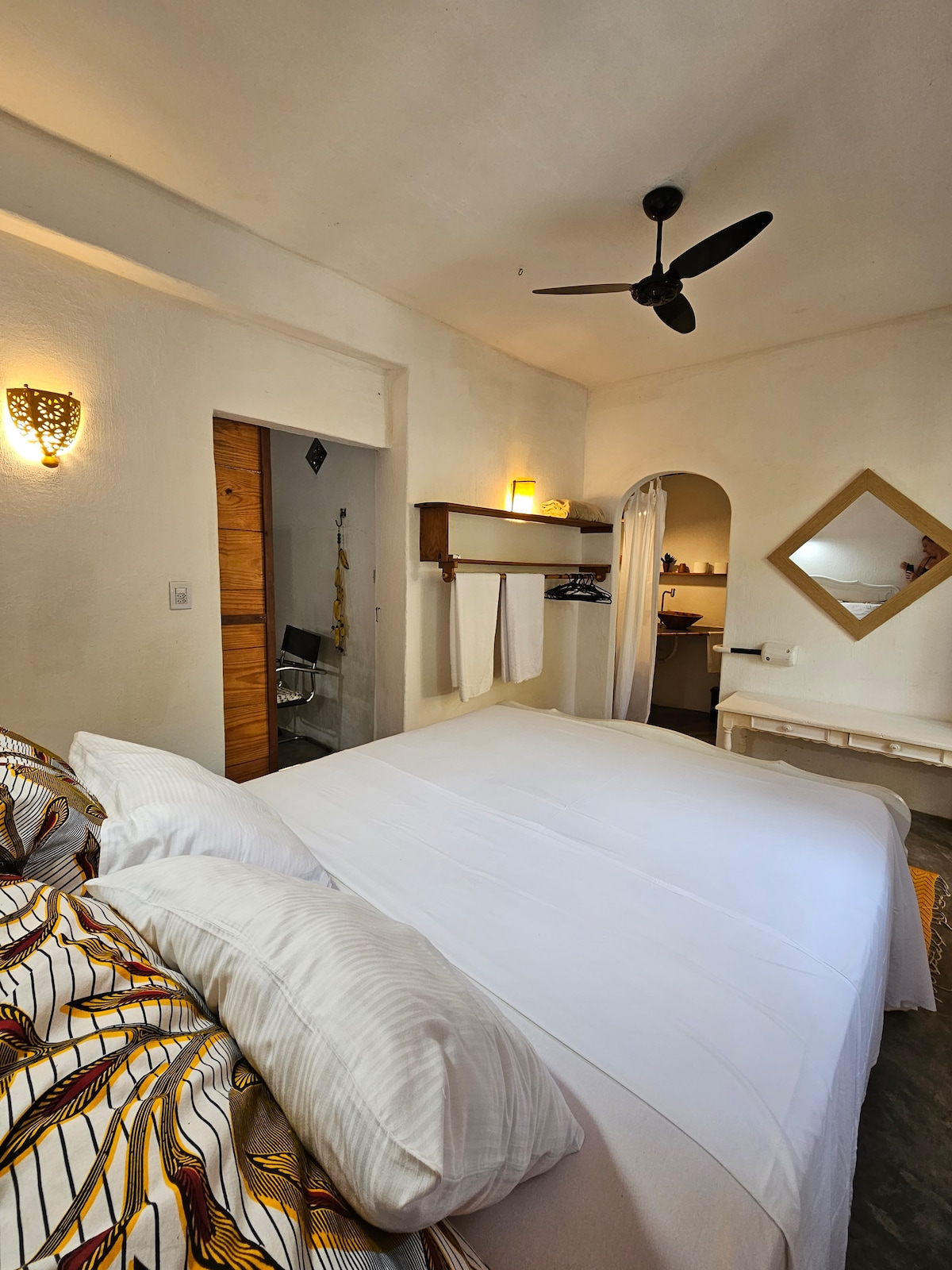 Lichte, luchtige loft op de 1e verdieping, geschikt voor 4 personen rond de stijlvolle Latijns-Amerikaanse keuken en de koele en kleurrijke lounge. De ene suite biedt airconditioning en een balkon met een puffe en hangmat, terwijl de andere met een koloniale fan een meer intieme ervaring boekt met zijn houten alcohol, spiraalvormige badkamer en muxarabi-raam, die doet denken aan India. In de lounge kunnen 2 banken worden omgetoverd tot bedden. Uitzicht op onze prachtige banaan en bossen.