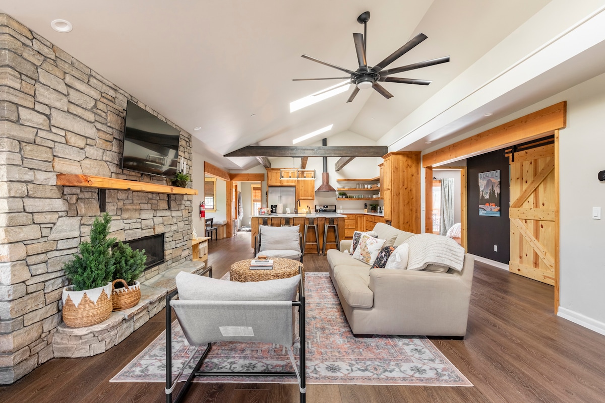 "Main Street Boarding House" is loaded with extras! Perfect for winter getaways! - hot tub - decks with mountain views - gas fireplace - gourmet kitchen - coffee bar - wine fridge - fire pit - porch swing - private creek & waterfall - incredible walkable location - steps to restaurants & shops - bus stop for Yosemite just steps away - 32 miles to Yosemite - large screen tv - multiple spots for morning coffee or evening glass of wine - level 1 EV charging - luxury rain head shower - gas grill