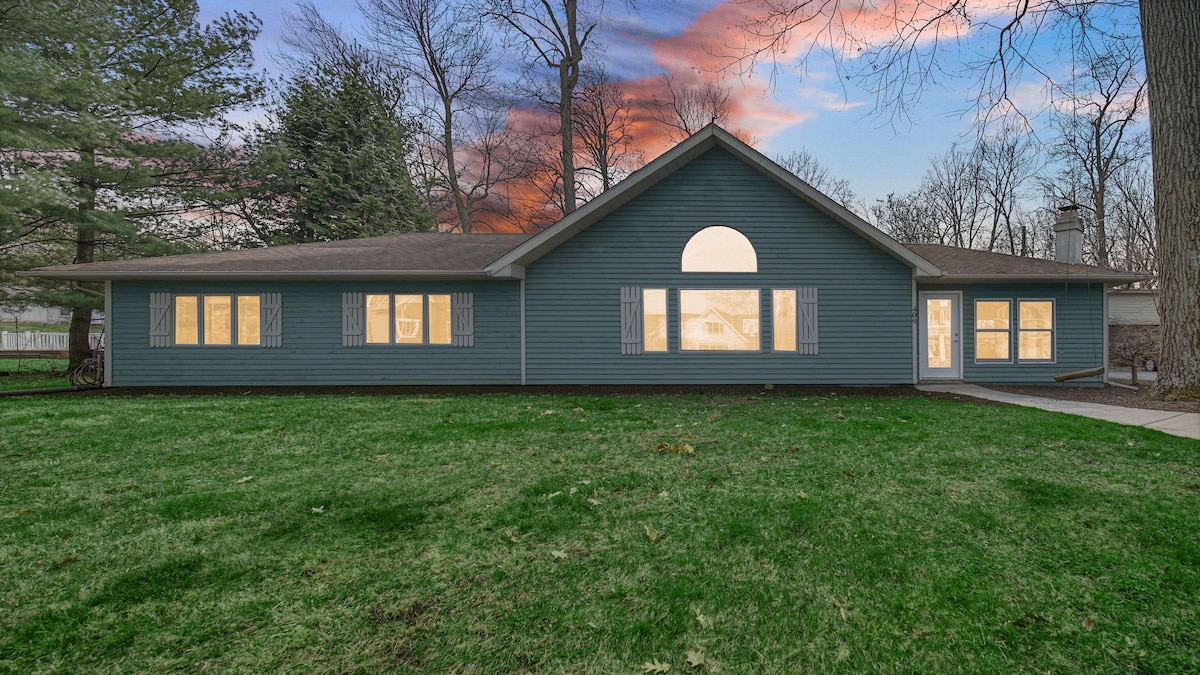 Centraal in Michiana, ruim en sereen, van plan om te ontspannen in het land! Wildlife loopt door het erf, sterren schitteren 's nachts. Loop over het grote terrein of kruip met een laptop of boek; je kunt een uur of dagen ontspannen - je keuze! Geniet van een maaltijd in of ga eropuit om lokale aanbiedingen op enkele minuten afstand te proeven. Neem een fiets mee - veel landelijke wegen om te verkennen! Het gebied heeft een dozijn kleine tot grote meren. Laat deze woning buigen als je thuisbasis voor het ontdekken of rustige R & R.